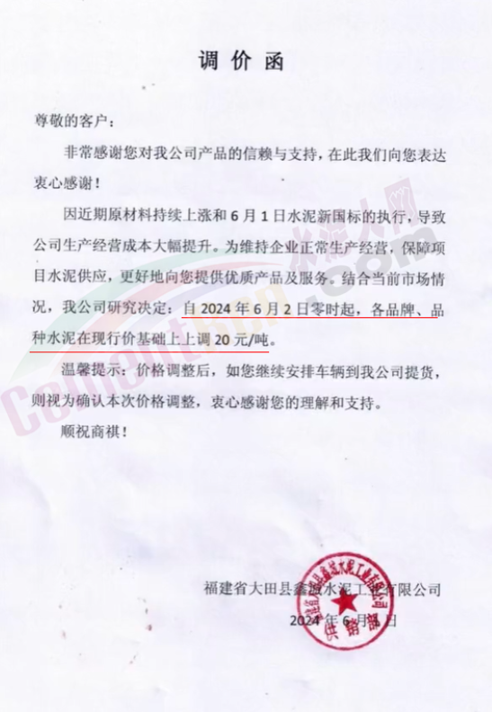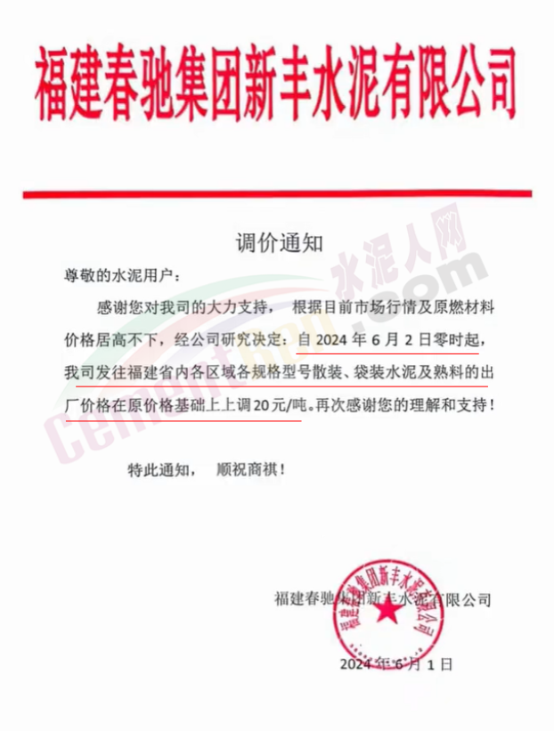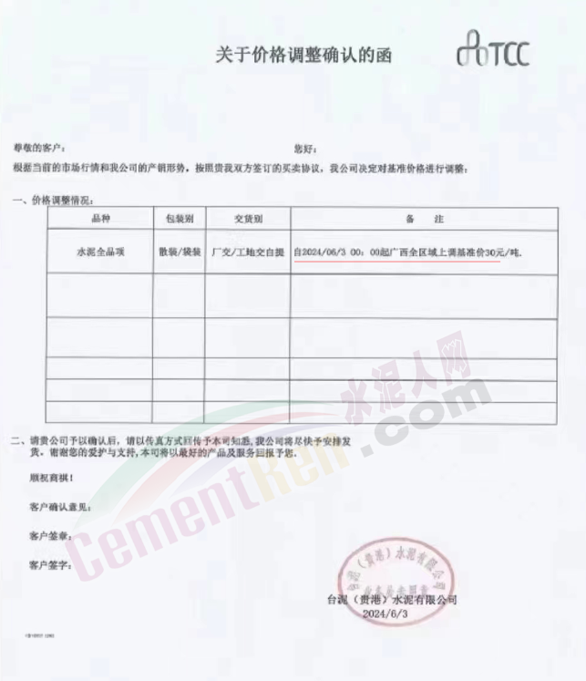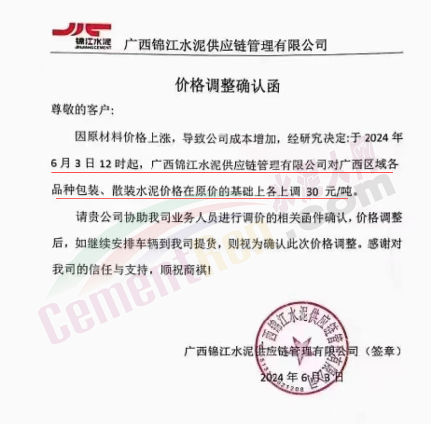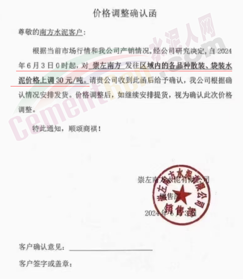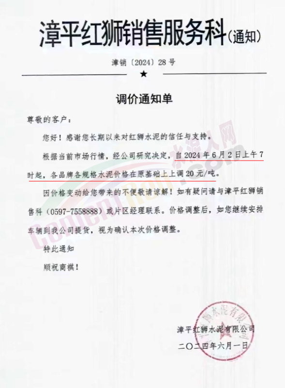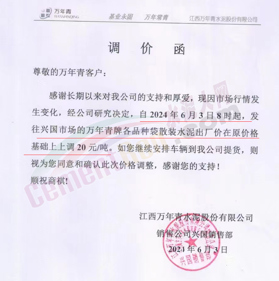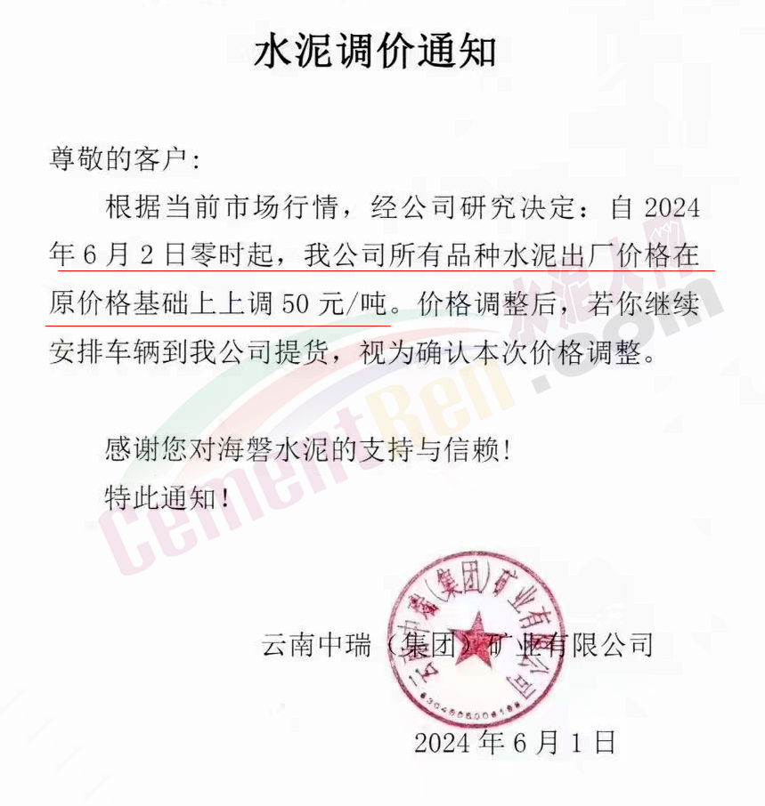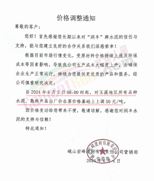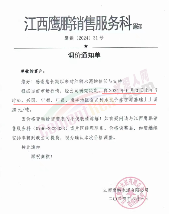 内蒙古自治区乌审旗力威建材有限责任公司通知,因通用硅酸盐水泥新标准GB175-2023于2024年6月1日起正式实施,致水泥生产成本大幅上涨,加之全国环保管控升级错峰生产因素影响,为保障公司正常生产运行,继续为客户提供优质产品与服务。经公司研究决定,自2024年6月6日12时起,对公司全品种水泥出厂价格上调50元/吨。