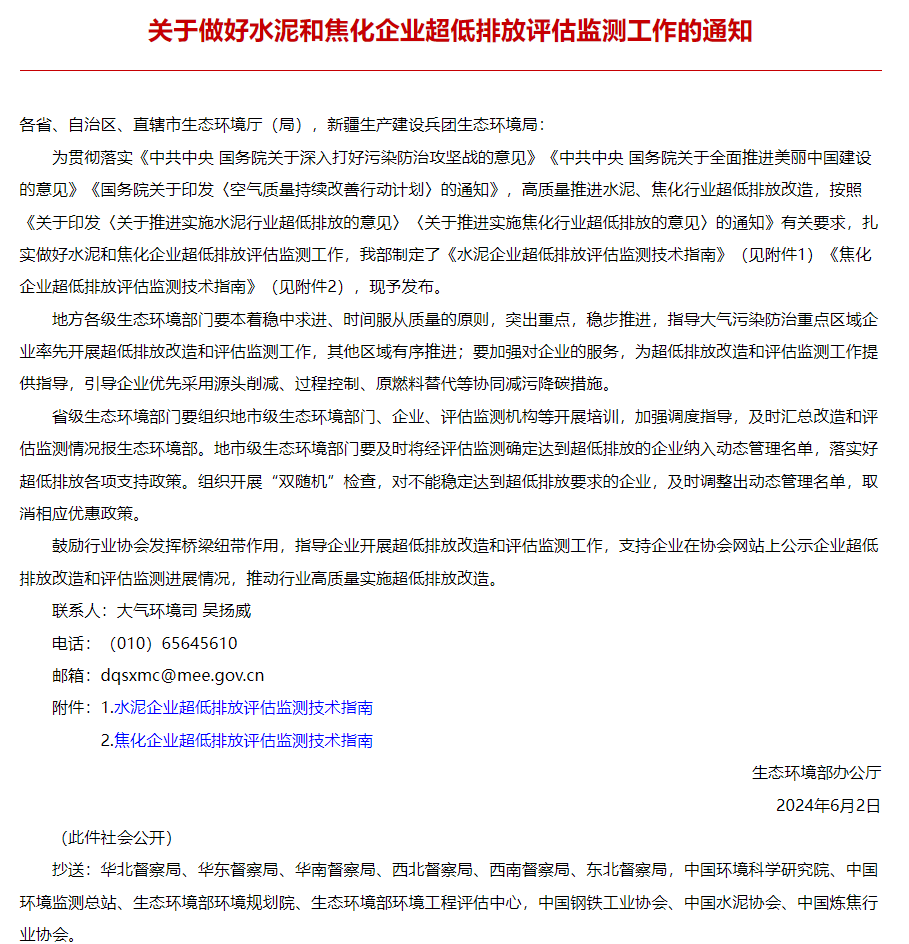 6月6日,生态环境部发布《关于做好水泥和焦化企业超低排放评估监测工作的通知》(以下简称“通知”)要求地方各级生态环境部门要本着稳中求进、时间服从质量的原则,突出重点,稳步推进,指导大气污染防治重点区域企业率先开展超低排放改造和评估监测工作,其他区域有序推进;要加强对企业的服务,为超低排放改造和评估监测工作提供指导,引导企业优先采用源头削减、过程控制、原燃料替代等协同减污降碳措施。