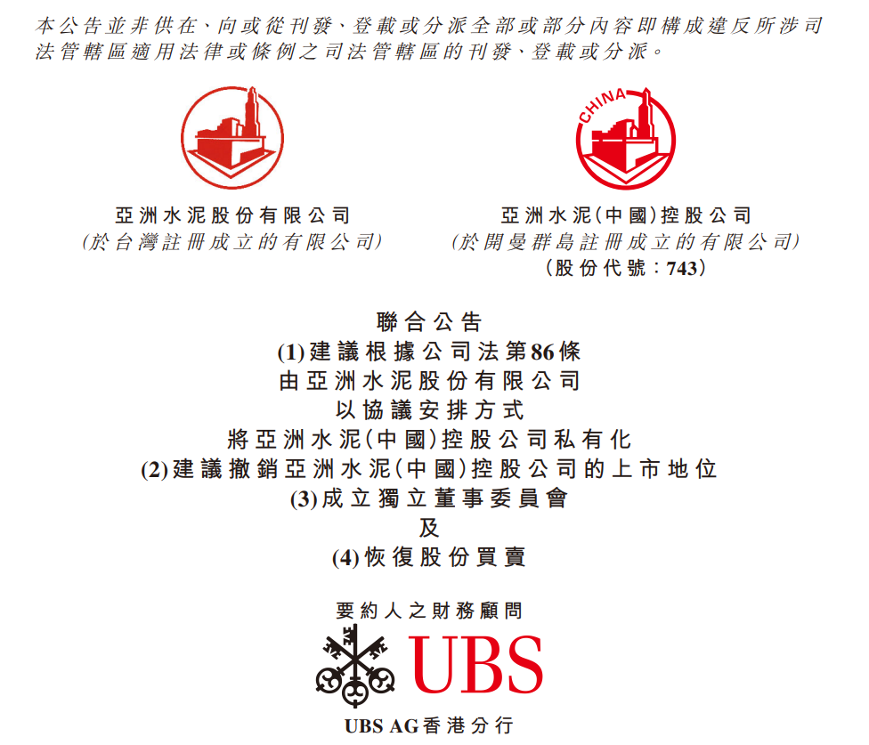 日前,亚洲水泥(中国)(00743.HK)公告,要约人(亚洲水泥股份有限公司,其股份于台湾证交所上市,并且为公司控股股东)与公司的相关董事联合宣布,于2024年6月5日,要约人就该建议根据公司法第86条以协议安排方式将公司私有化,请求董事会向计划股东提呈该建议,其中涉及注销计划股份,并且作为注销该等股份的代价,就每股计划股份以现金向计划股东支付要约价,以及撤销股份于香港联交所的上市地位。