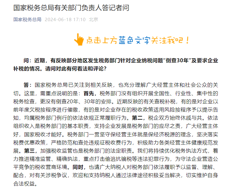 6月18日,国家税务总局官方微信发布答记者问消息。”辟谣“部分地区发生税务部门针对企业纳税问题“倒查30年”及要求企业补税的相关问题。