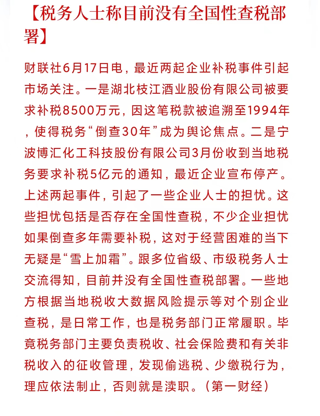 据了解,最近两起企业补税事件引起市场关注。一是湖北枝江酒业股份有限公司被要求补税8500万元,因这笔税款被追溯至1994年,使得税务“倒查30年”成为舆论焦点。二是宁波博汇化工科技股份有限公司3月份收到当地税务要求补税5亿元的通知,最近企业宣布停产。