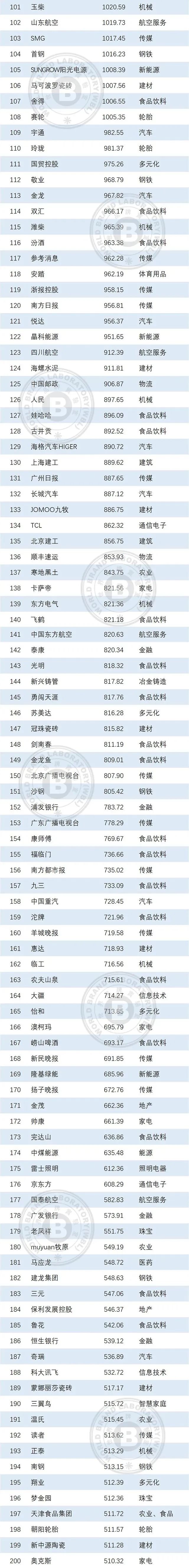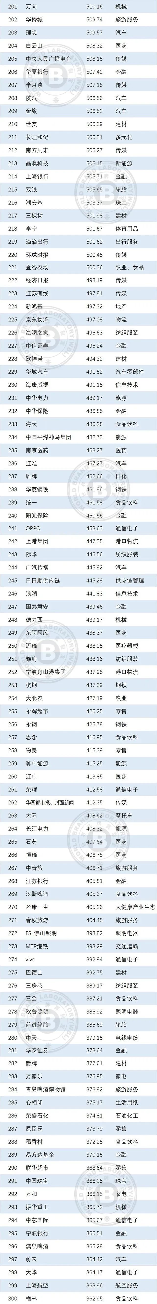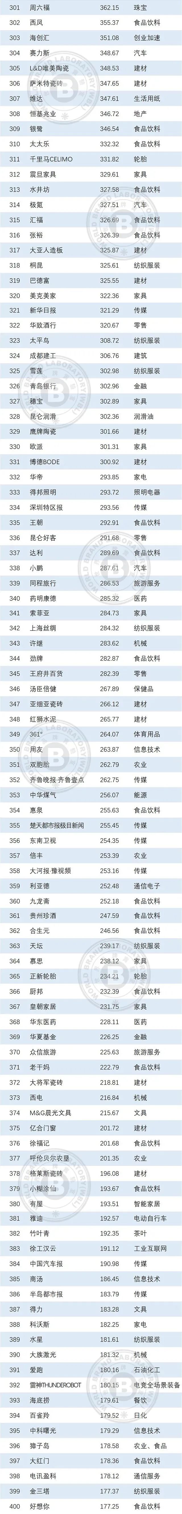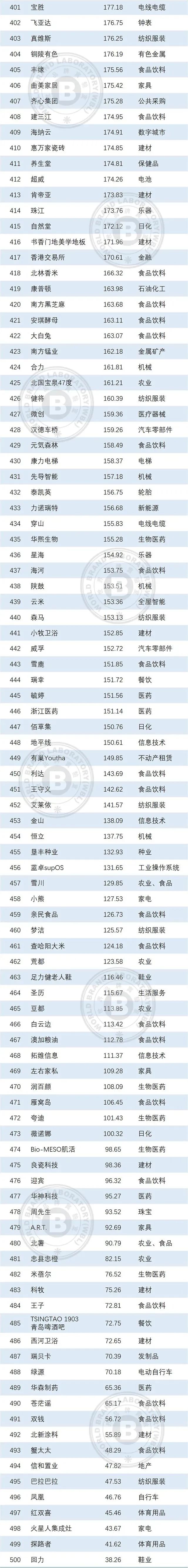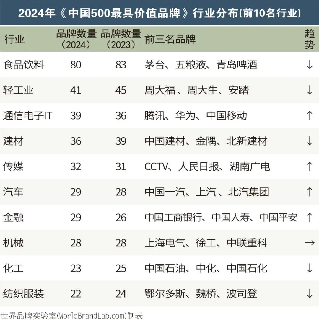 本年度《中国500最具价值品牌》排行榜中,共有来自食品饮料、轻工业、建材、传媒、纺织服装、医药、机械等在内的24个相关行业的品牌入选。其中食品饮料业依然是入选品牌最多的行业,共有80个品牌入选,占总入选品牌数的16.00%;入选数量位居第二到第五的行业分别是轻工(41个)、通信电子IT(39个)、建材(36个)、传媒(32个)。在衡量品牌的忠诚度时,世界品牌实验室参考了我信品牌(iTrust Rating)的评级数据;在衡量品牌的领导力特别是ESG(环境、社会和治理)评分时,参考了超级财经(SuperFinance)的ESG数据库。同时还借用了低碳国际(Carboncare International)对品牌企业碳排放的计量,以推动品牌添加“碳排放评分”标签。