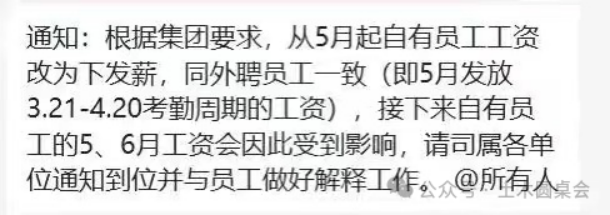 中建某局前期流出消息称:集团薪资结构自有员工也开始进行调整了,根据集团要求,从五月起自有员工工资改成下发薪,同外聘员工一起5月发放:3月21~4月20日的考勤周期的工资,接下来几个月自有员工的工资会因此受到影响,请各单位及时与员工做好沟通解释。