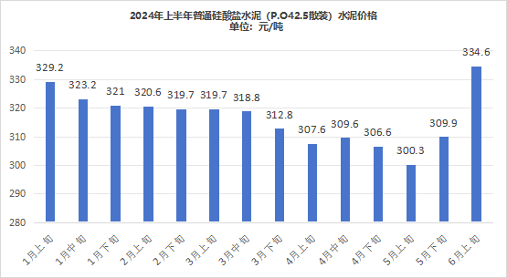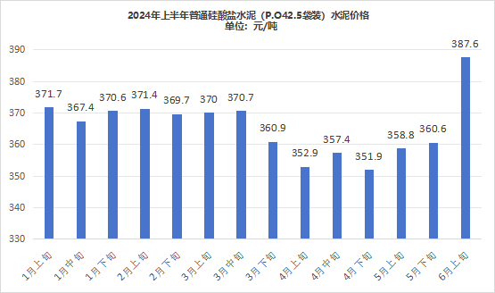 从上半年全国P.O42.5袋、散装水泥价格的变化情况来看,1~3月底,全国水泥价格维持在370元/吨左右,3月中旬至5月上旬,全国水泥价格出现下滑,下滑幅度在20元/吨左右。