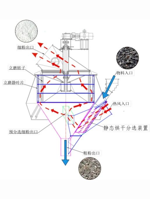 传统立磨系统中,被粉磨物料都是通过中心喂料或边沿喂料的方式,物料直接送到旋转的磨盘上。物料在离心力作用下向磨盘边缘移动的过程中,经磨辊碾压粉磨后,被甩到磨盘周围的喷嘴环上,喷嘴环内高速喷出的热风将物料烘干、打散和分选,粗颗粒物料落回磨盘被再次粉磨,细粉随风进入立磨选粉机二次分选,合格细粉进入转子,作为成品收集入库,不合格细粉落回磨盘,进入下一个粉磨、烘干、打散、分选的循环。
