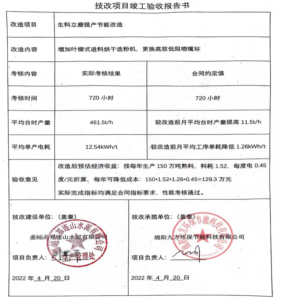 经过改造后按每年生产150万吨熟料,料耗1.52,每度电0.45度/元计算,每年可降低成本:150*1.52*1.26*0.45=129.3万元。