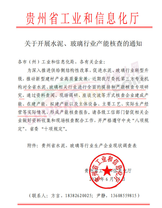 日前,贵州省工信厅发布《关于开展水泥、玻璃行业产能核查的通知》给辖区各市(州)工业和信息化局,各有关企业称,为深入推进供给侧结构性改革,促进水泥、玻璃行业转型升级,推动新型建材产业高质量发展,近期贵州省工信厅厅委托第三方专业机构对全省水泥、玻璃相关行业进行全面的摸排和产能核查专项研究,通过资料查阅、现场调研、座谈交流等方式核查企业建成产能、在建产能、拟建产能以及主体设备、主要工艺、实际生产经营等实际情况,形成产能核查报告。请各级工信部门督促相关企业做好资料收集和现场核查配合工作,并严格遵守中央“八项规定”,省委“十项规定”。