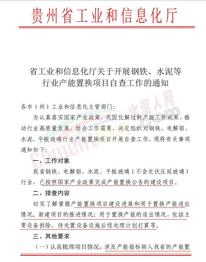 贵州省工信厅同期发布《关于开展钢铁、水泥等行业产能置换项目自查工作的通知》称,为认真落实国家产业政策,巩固化解过剩产能工作成果,推动行业高质量发展,结合工作需要,决定组织对钢铁、电解铝、水泥、平板玻璃行业产能置换项目开展自查工作。