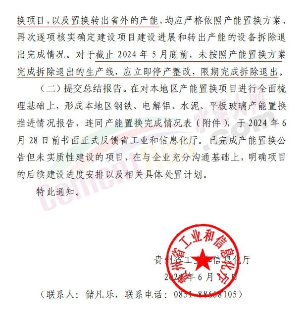 要求涉及产能指标转入贵州省的产能置换项目,以及置换转出省外的产能,均应严格依照产能置换方案,再次逐项核实确定建设项目建设进展和转出产能的设备拆除退出完成情况。对于截止2024年5月底前,未按照产能置换方案完成拆除退出的生产线,应立即停产整改,限期完成拆除退出。