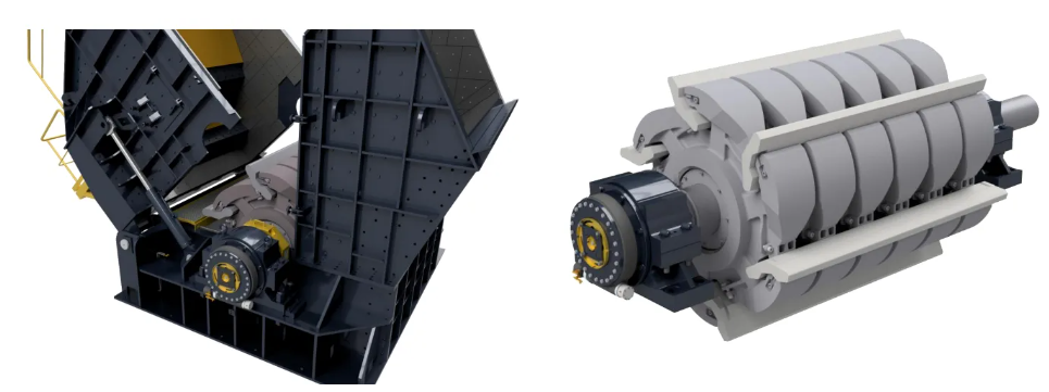 HPI破碎机有两个反击板,也可以配备研磨架。转子能够处理高达3m³的进料,研磨路径限制了超大产品的数量。反击板和磨削架的间隙设置可以通过主轴进行调整,也可以通过液压控制,并允许对最终产品的粒度进行最佳控制。其中,转子是破碎过程中的关键部件。其主体与轴和轴承一起构成了反击式破碎机的“心脏”。