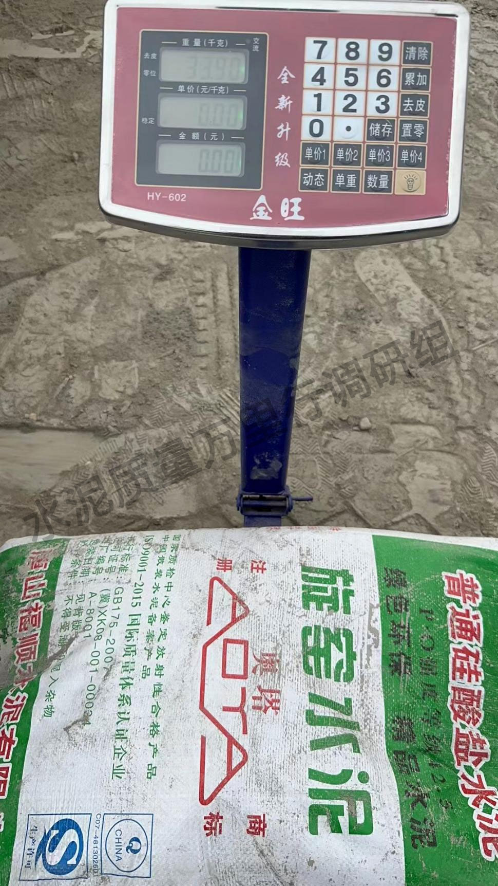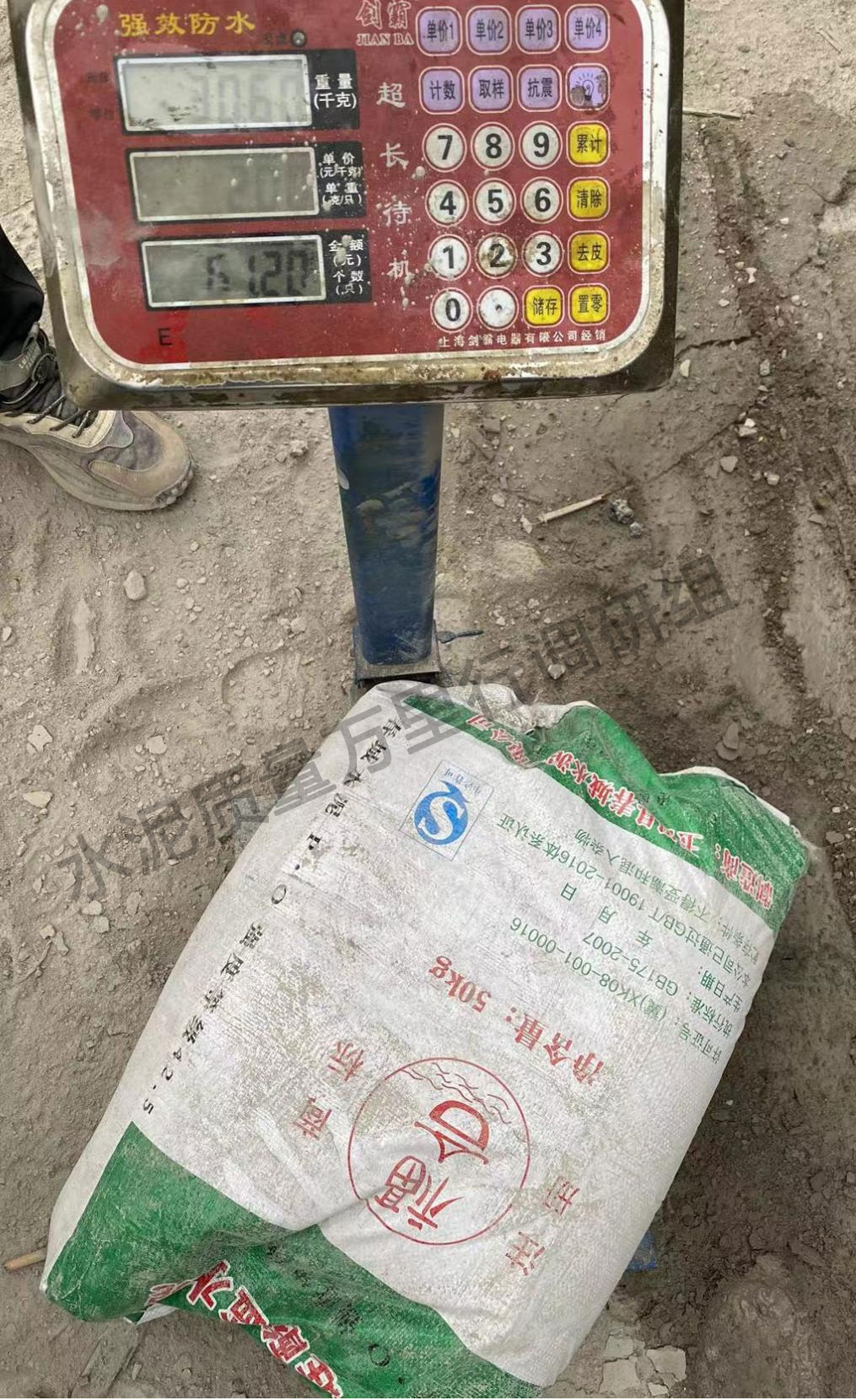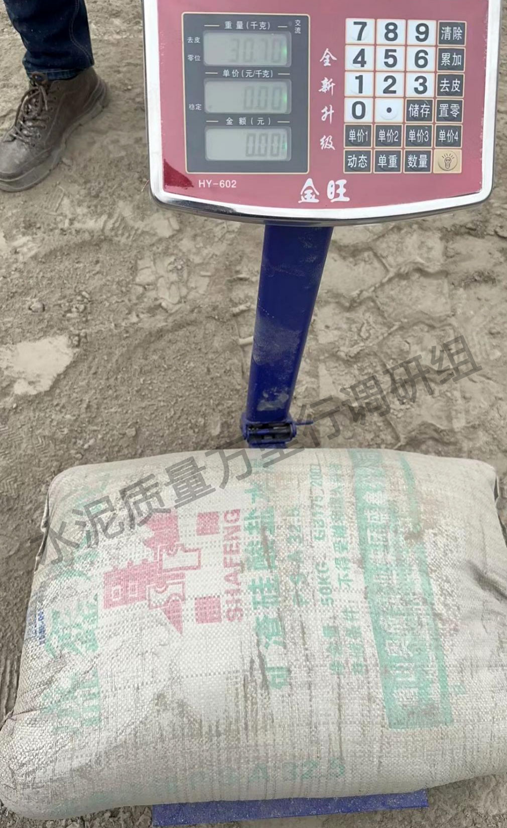 标称生产企业唐山奥成水泥厂的“盛鑫”牌PSA32.5(50kg)水泥,实际称重为30.7kg。