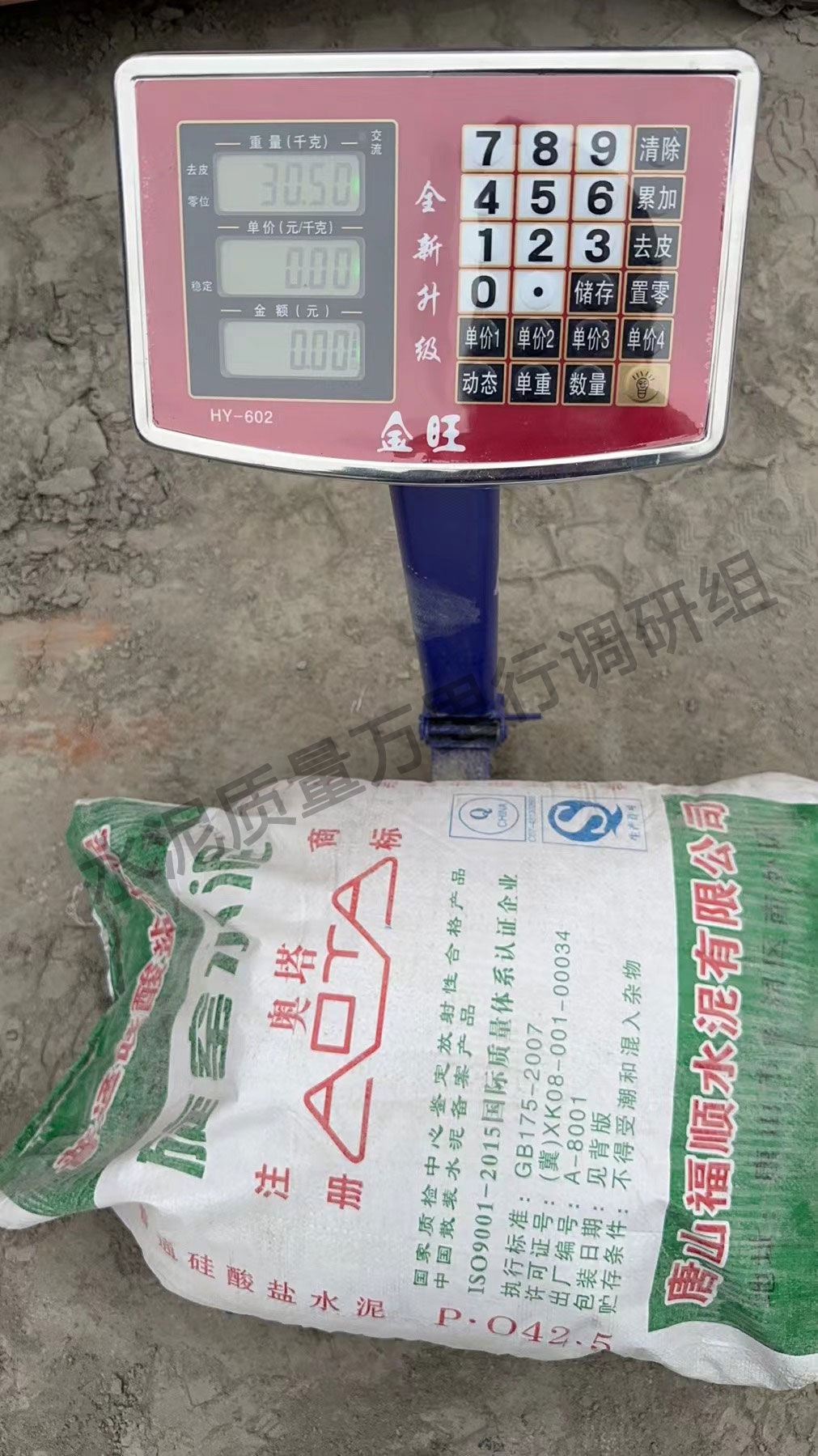 标称生产企业为玉田县春城水泥厂的“福合”牌PO42.5(50kg)水泥,实际称重为30.6kg。