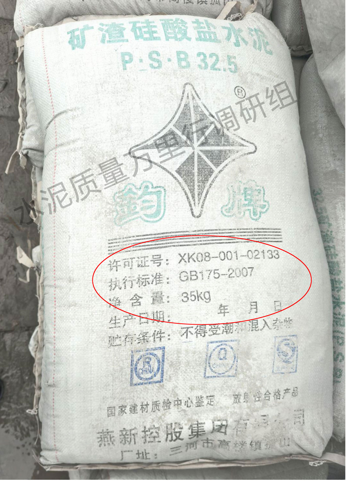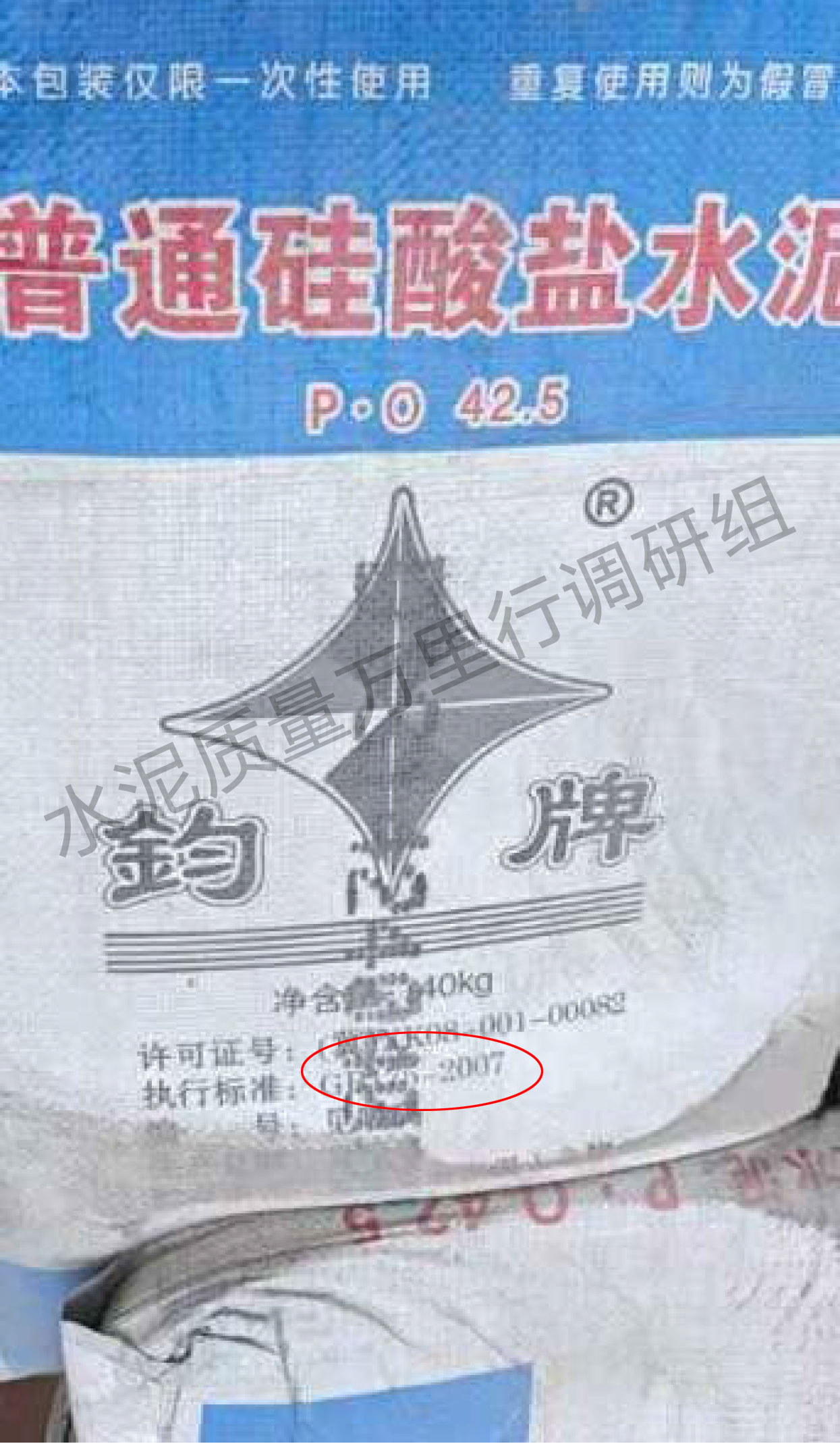 上面这些尚有据可查,还有部分“三无产品”——无生产日期、无生产厂家、无生产许可证号或生产许可证号和标称厂家查无此厂的情况。此类产品分布在北京市多个区县,日销量百余吨。此外,还有包装袋印刷相关信息错乱情况,屡见不鲜,如:标称为“钧牌”P.O42.5水泥的执行标准引用过期水泥标准GB175-2007。
