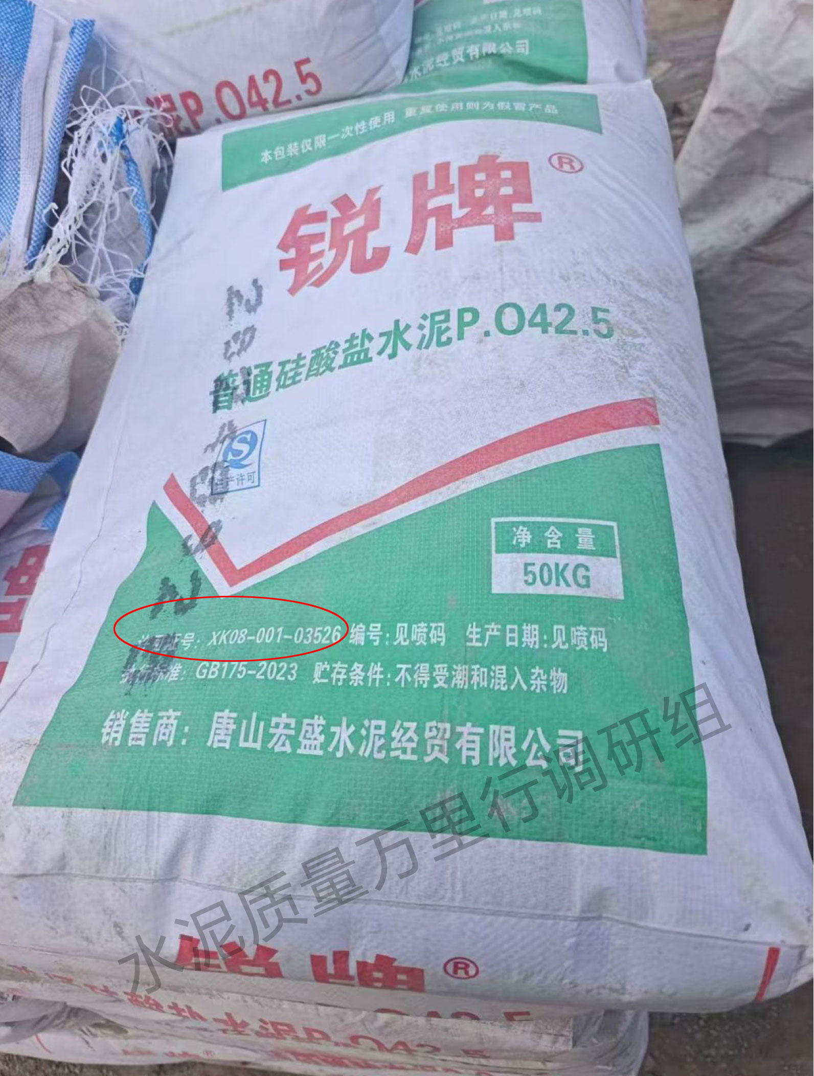 标称销售商为唐山宏盛水泥经贸有限公司的“锐”牌P.O42.5水泥,许可证编号:XK08-001-03526。据查询,该许可证企业主体为保定宝硕水泥有限公司,发证日期2012年5月18日,有效期至2017年5月17日。在该批次产品包装上未见标称生产企业名称。