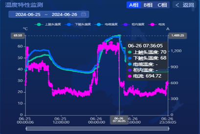 2024年6月23日凌晨,企业总降变电站10kV进线柜触发“开关A相触头温度高”预警,电气智能化管理系统向系统网页端、手机APP及微信实时推送告警信息。运维人员收到预警后,第一时间查看系统进线柜别的参考数据。