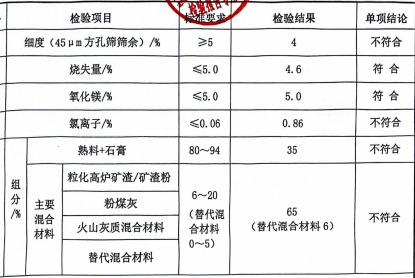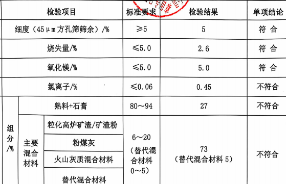 标称生产企业为唐山润德水泥有限公司的“硕磊”牌P.O42.5水泥,检验结果显示氯离子含量0.45%,是标准限值的7.5倍。组分项目检验结果也与标准要求不符合,熟料+石膏实测只有27%,主要混合材为73%。