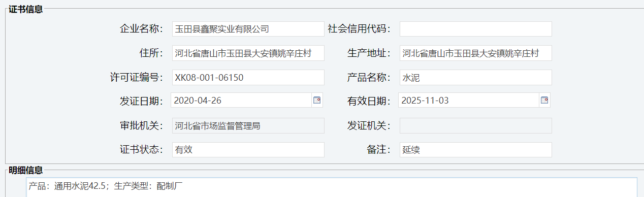 据查询,玉田县鑫聚实业有限公司生产地址位于河北省唐山市玉田县大安镇姚辛庄村。生产许可证编号XK08-001-06150有效期至2025年11月3日,许可产品为通用水泥42.5;生产类型为配制厂。“玉梦”牌为玉田县鑫聚实业有限公司自有注册商标,目前在北京市场主要流向门头沟区。