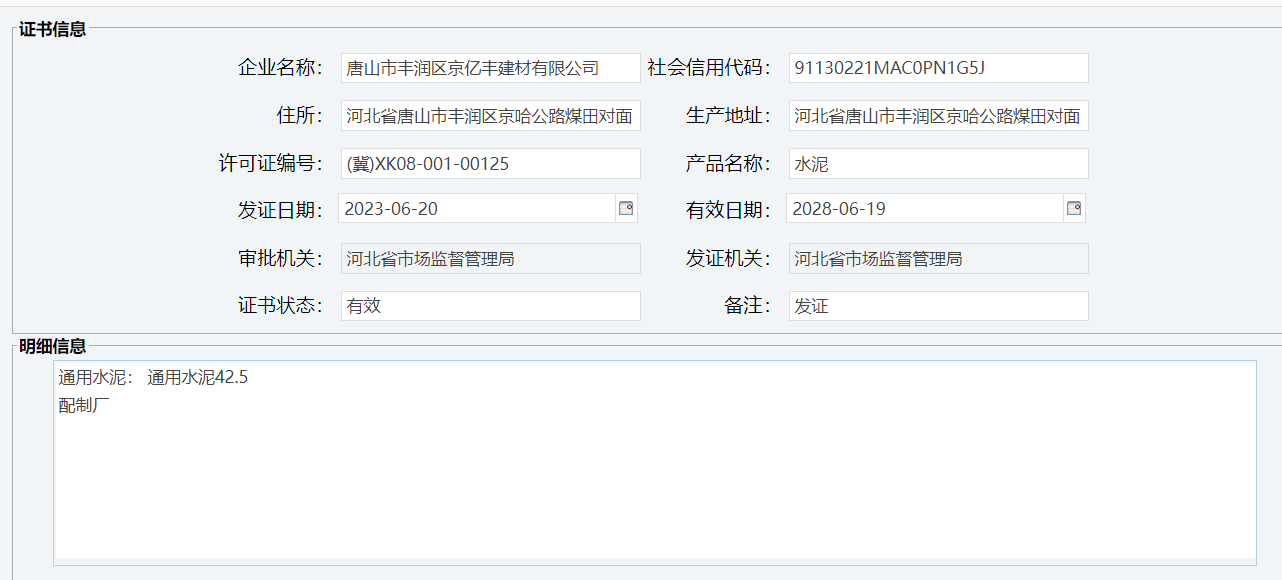 据查询,该企业生产地址位于河北省唐山市丰润区京哈公路煤田对面,生产许可证编号(冀)XK08-001-00125有效期至2028年6月19日。许可产品为通用水泥42.5,企业类型为配制厂。目前在北京市场主要流向丰台、房山、门头沟、朝阳区等多个建材市场。