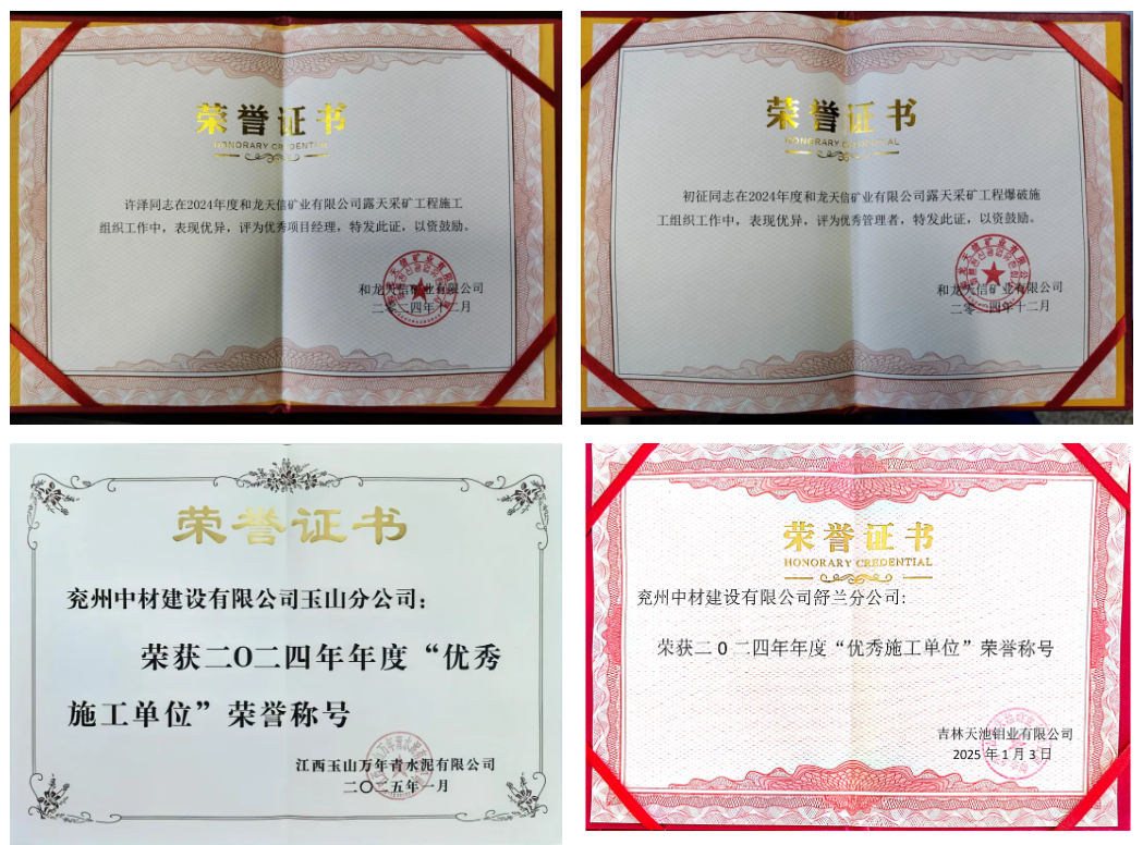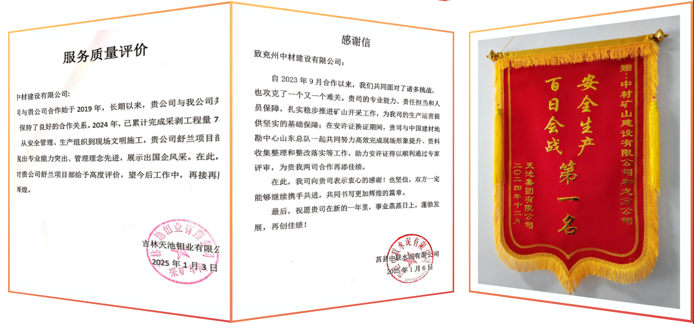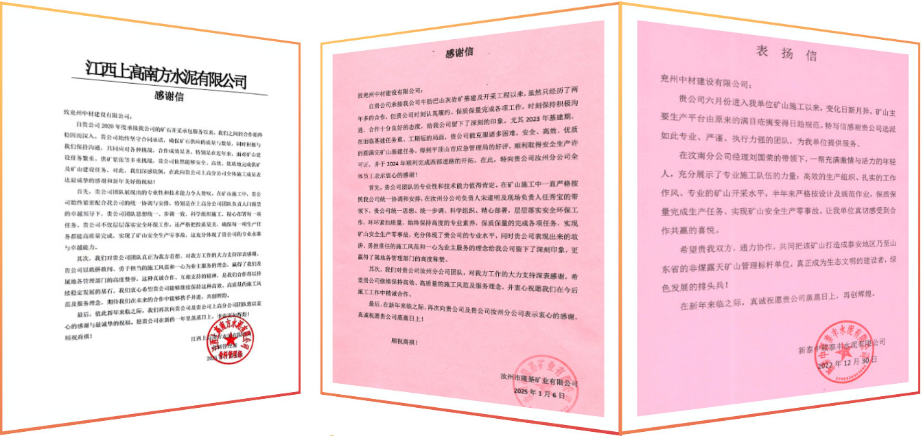 新年伊始,中材矿山各所属公司收到了来自多方业主的表彰和感谢信。这不仅是对我们过去工作的肯定,更是对我们未来的激励。我们始终秉持着专业、负责的态度,发扬矿山人精神,努力为业主提供优质的服务。