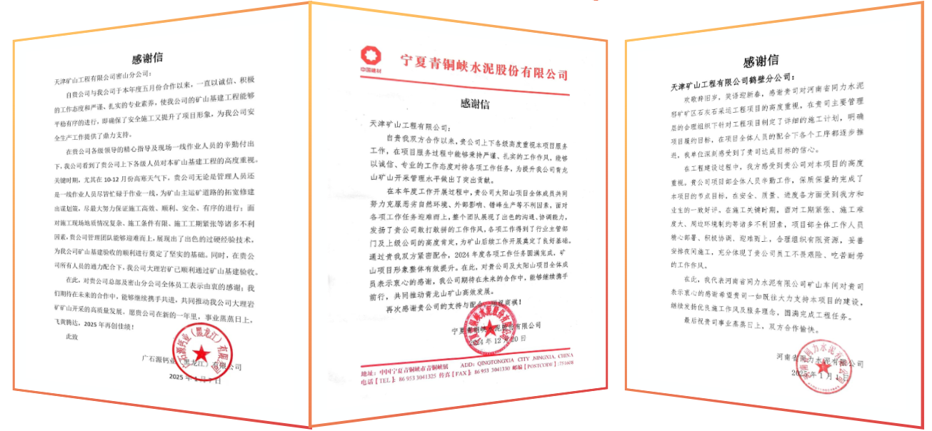 天津矿山工程有限公司收到各业主方发来的感谢信。2024年,天津矿山克服了恶劣的环境因素,凭借着高效的组织协调能力和过硬的技术水平,解决了各种困难,确保了工程质量和进度,充分展现了我公司员工不畏艰险、吃苦耐劳的工作作风。业主方对天津矿山的各方面工作给出了高度评价。下一步公司将再接再厉,与业主方精诚合作,同心合力、和衷共济,确保圆满完成各项任务。