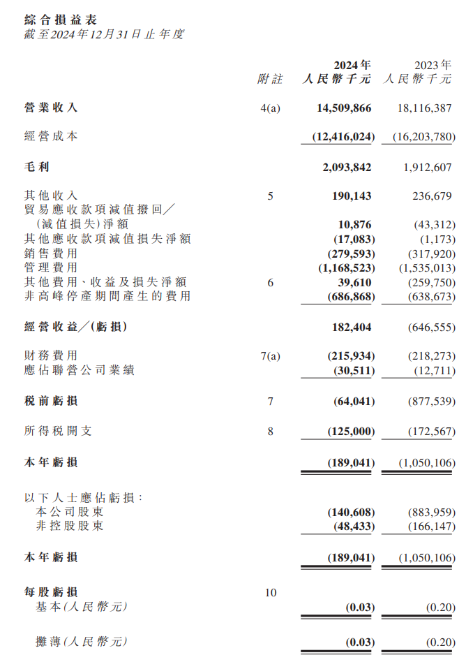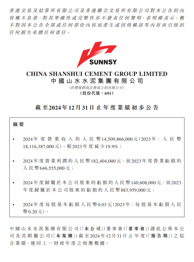 日前,山水水泥公布2024年业绩,营业收入约人民币145.1亿元,较2023年度减少19.9%;归属于公司股东的亏损约人民币1.41亿元,同比收窄84.09%;每股基本亏损人民币0.03元。 报告期内,该集团销售水泥、熟料合计5178.3万吨,同比减少17.7%;销售商品混凝土227.2万立方米,同比减少25.5%。收益减少主要由于本年度水泥销量同比减少15%及价格同比下降3%所致。 本年度亏损主要由于水泥受市场需求疲弱,销量下降所致。惟因本年度各项成本及费用控制措施下,营业毛利上升,销售、管理及财务费用皆有不同程度的降幅,因而全年亏损同比收窄。
