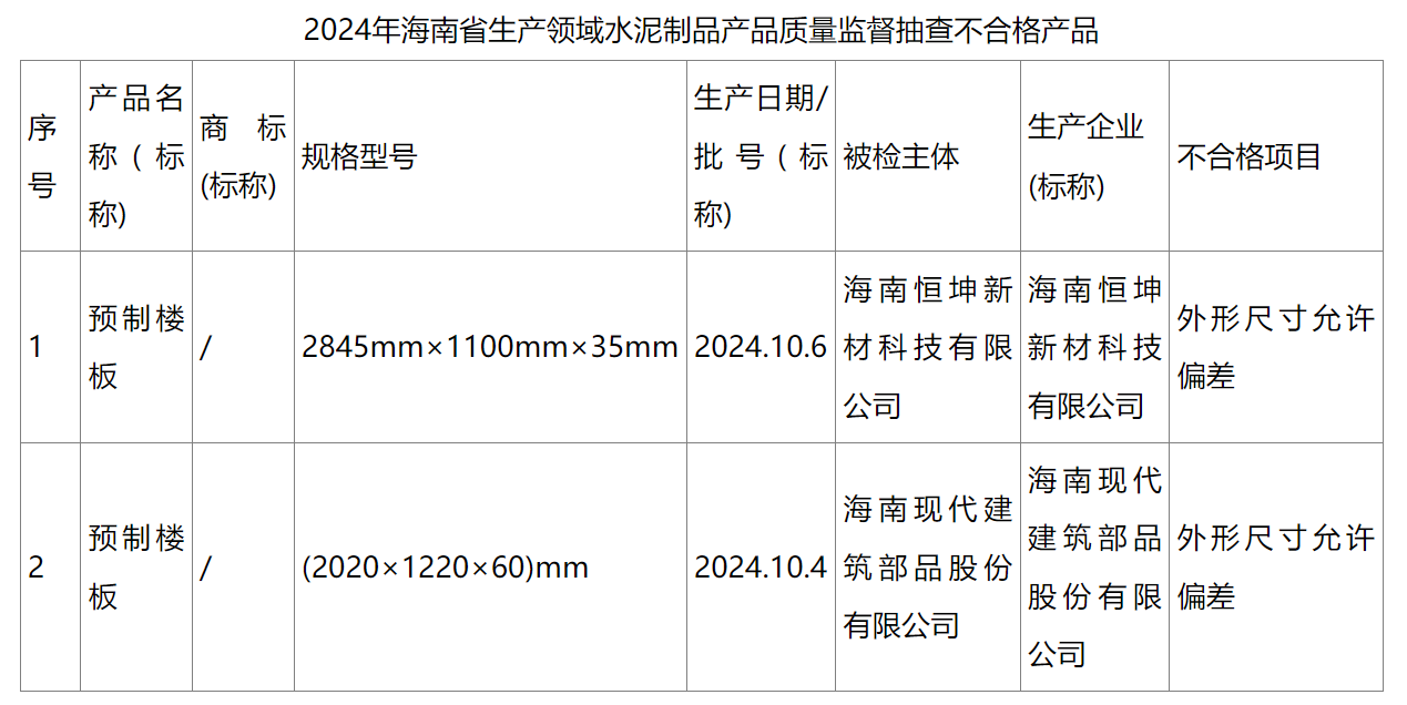 同期公布,2024年海南省生产领域水泥制品产品质量监督抽查结果显示,共抽查了40批次产品,经检验,有2批次不符合标准要求,涉及的不合格项目为,外形尺寸允许偏差。