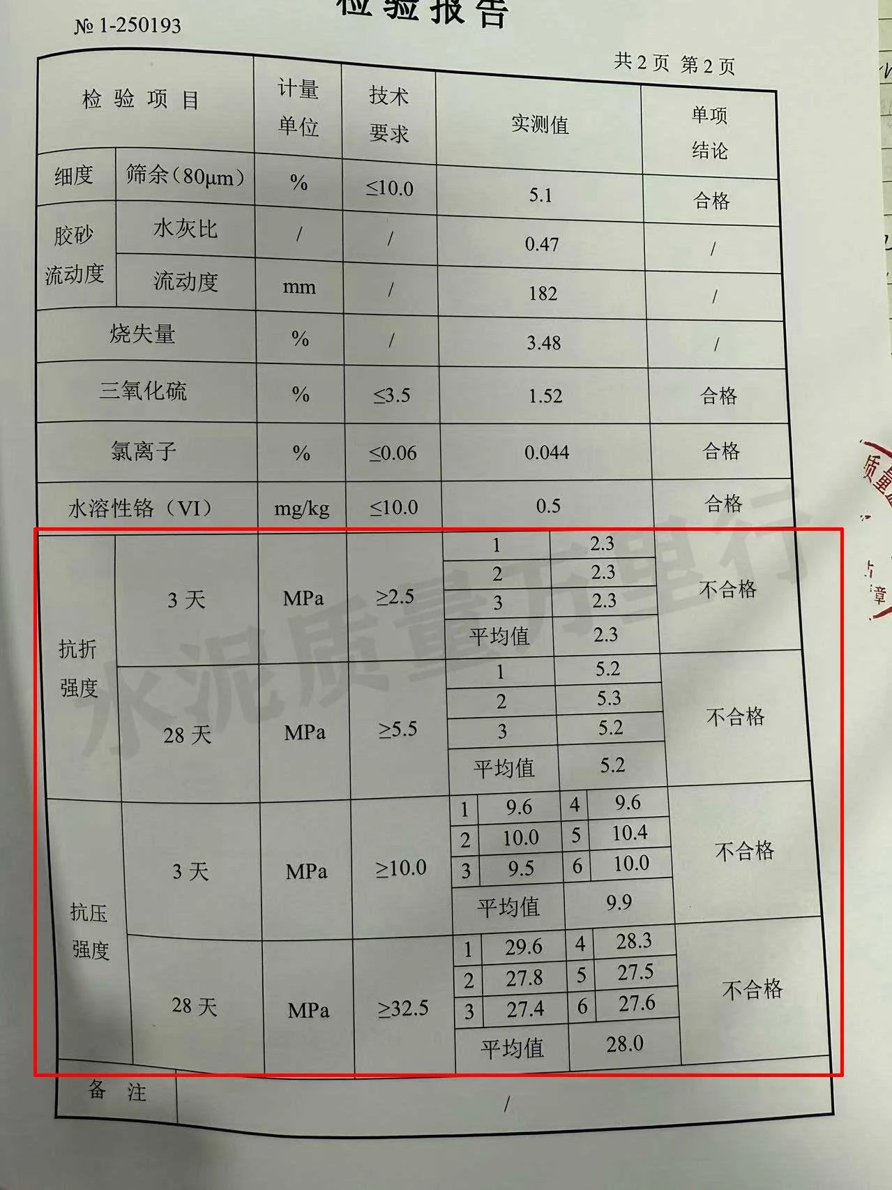 为进一步核实情况,水泥质量万里行组委会工作人员在该市场购买样品并委托权威机构检验。检验报告显示,该批次水泥抗压抗折强度与标准要求严重不符,被判定为不合格产品,这也证实了消费者投诉并非空穴来风。