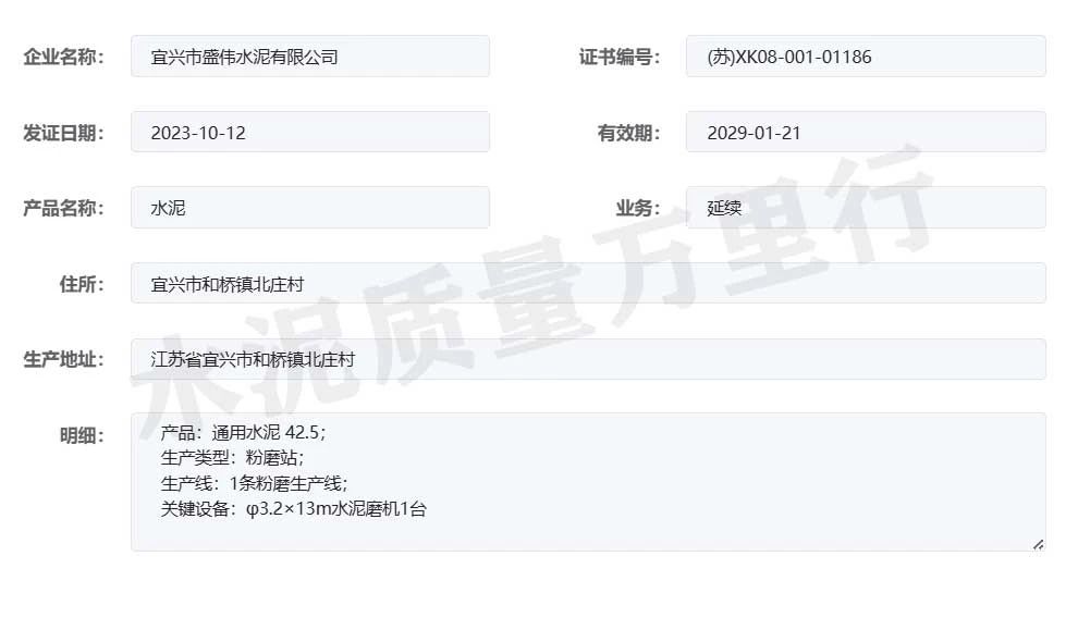 据江苏省市场监管局数据,宜兴市盛伟水泥有限公司生产许可证,编号为(苏)XK08-001-01186.证书有效期从2023年10月12日至2029年1月21日,生产地址位于江苏省宜兴市和桥镇北庄村。该公司许可产品为通用水泥42.5.生产类型为粉磨站,拥有1条粉磨生产线,关键设备是1台3.2x13m水泥磨机。企业具备生产能力,证后监管却无从保障。