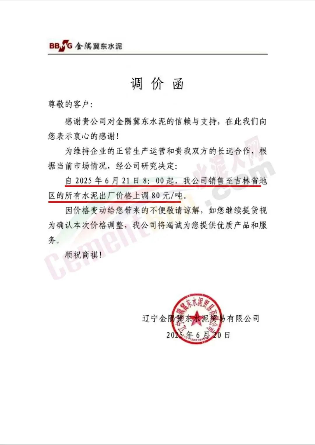 辽宁金隅冀东水泥贸易有限公司通知称,为维持企业的正常生产运营,根据当前市场情况,经公司研究决定,自2025年6月21日8时起,公司销售至吉林省地区的所有水泥出厂价格上调80元/吨。