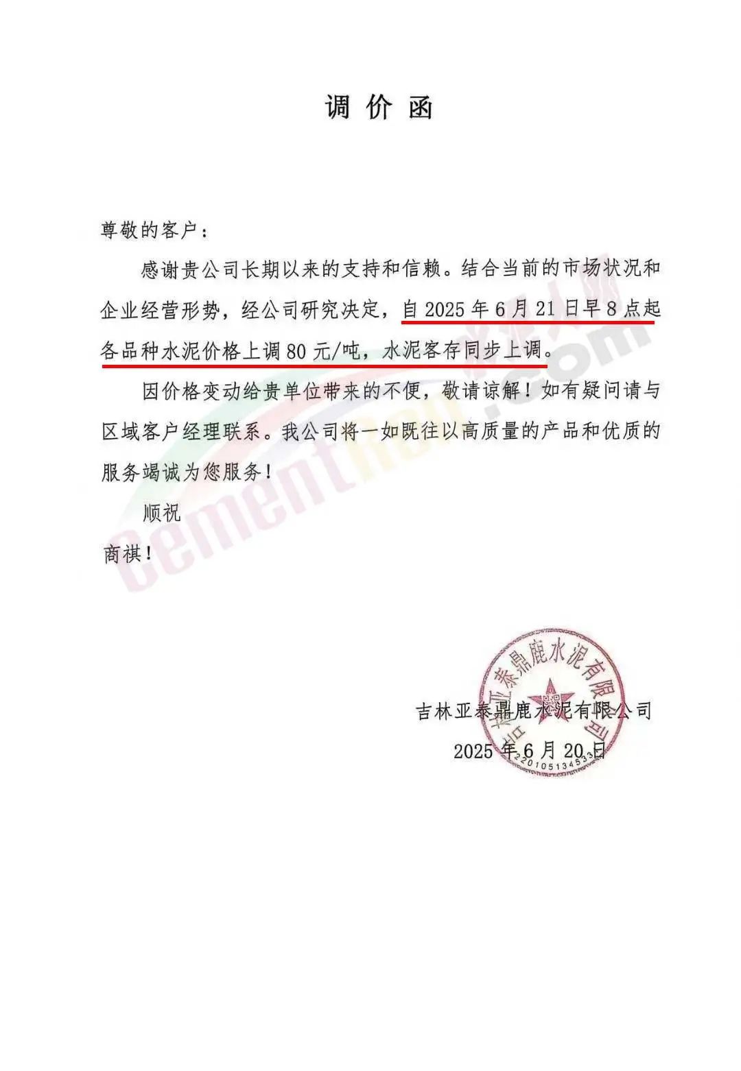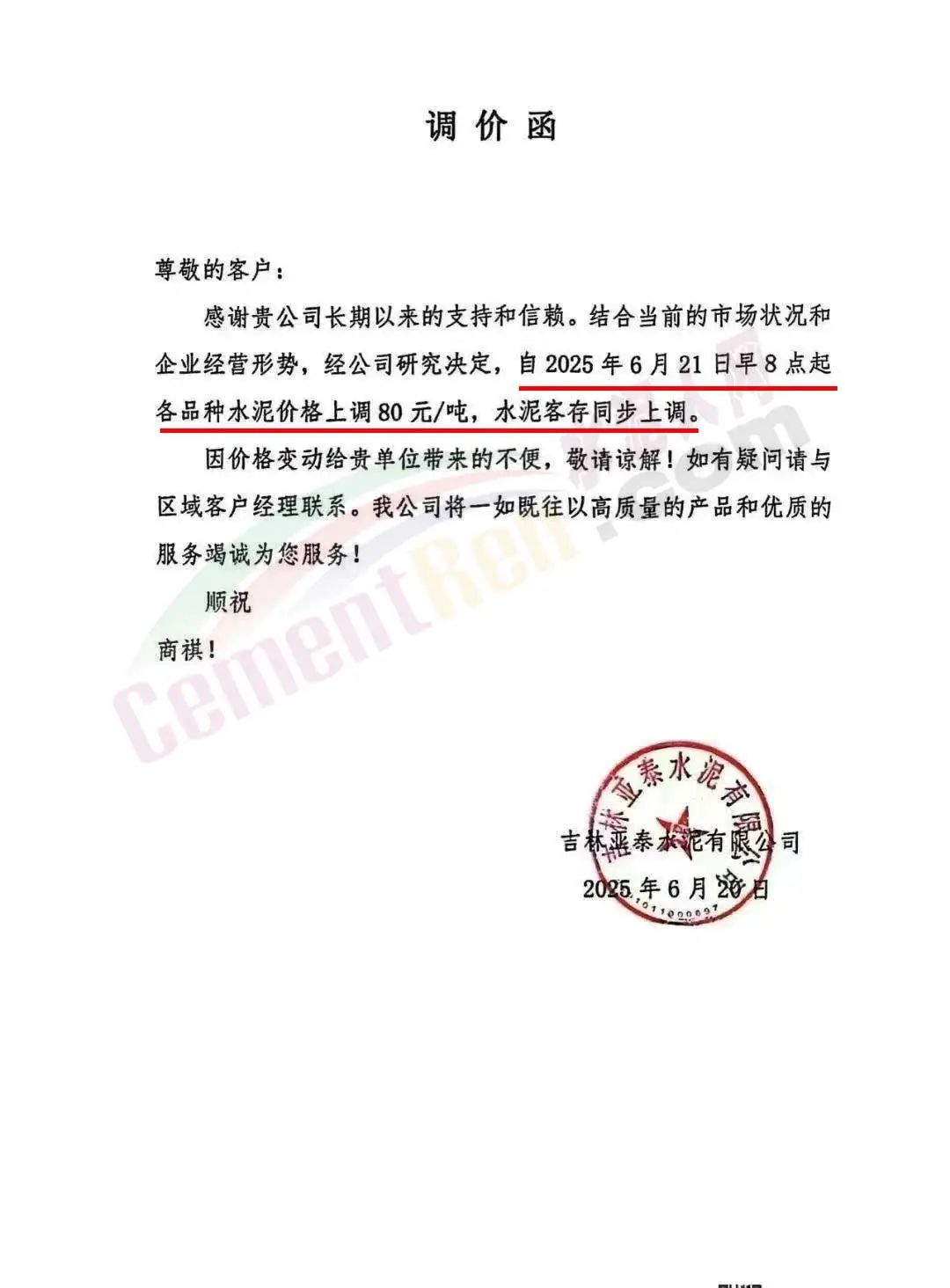 吉林亚泰水泥有限公司通知,自6月21日早8点起各品种水泥价格上调80元/吨,水泥客存同步上调。
