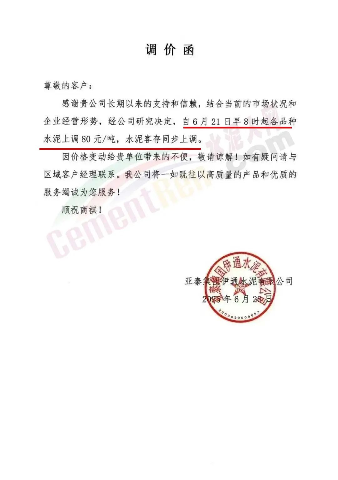 亚泰集团伊通水泥有限公司通知,结合当前的市场状况和企业经营形势,经公司研究决定,自6月21日早8时起各品种水泥上调80元/吨,水泥客存同步上调。
