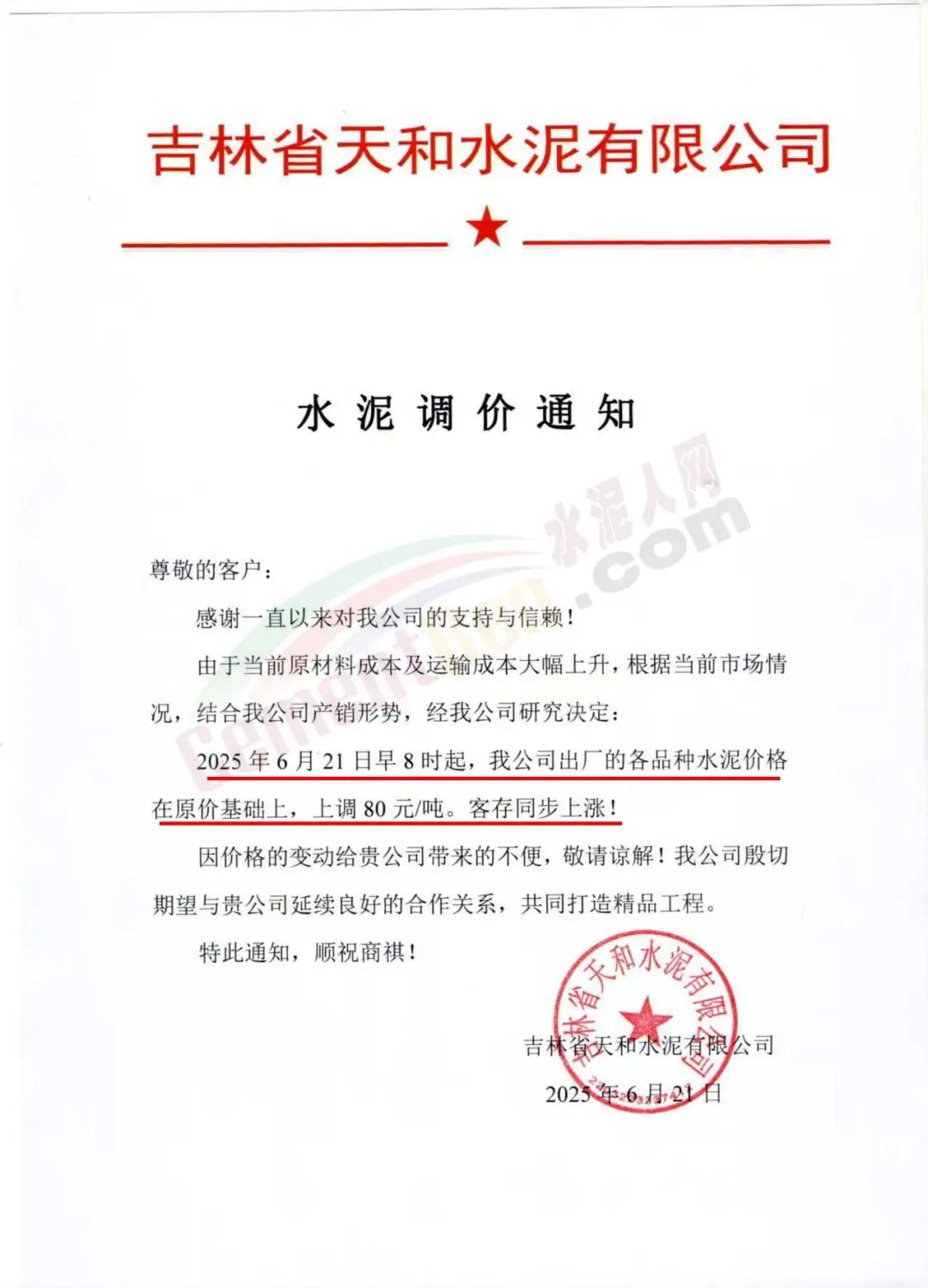 吉林天和水泥通知,自6月21日起,公司出厂的各品种水泥价格在原价基础上上调80元/吨,客存同步上涨。