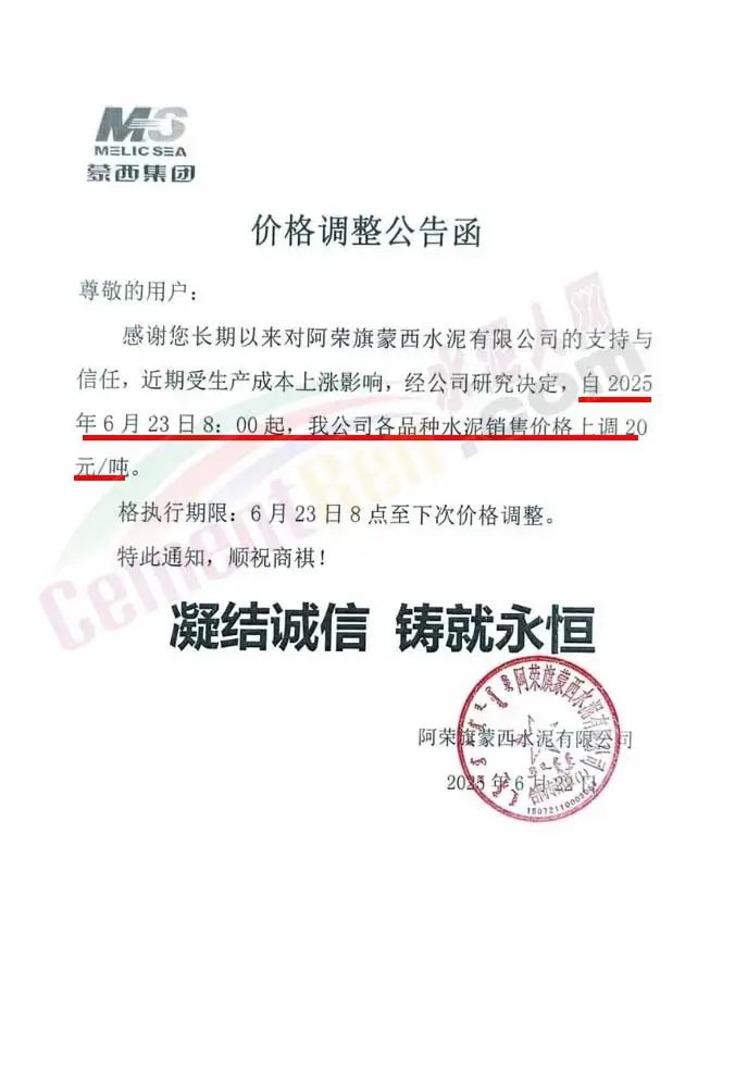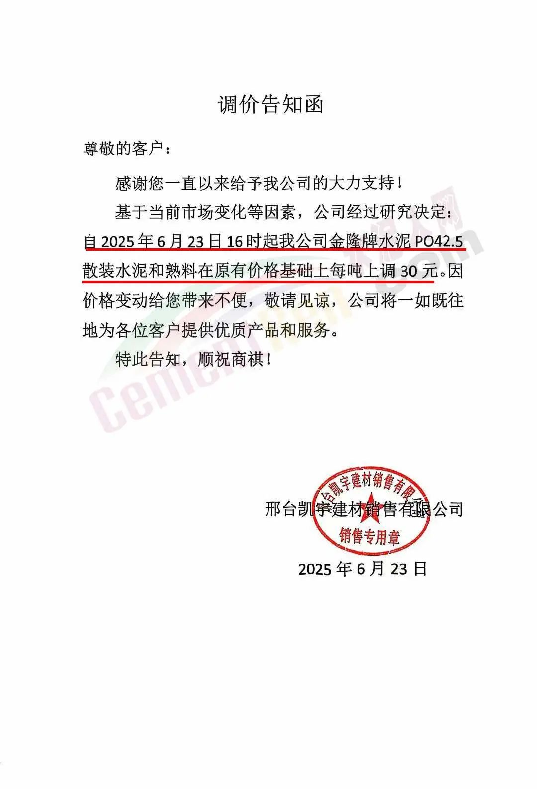 邢台凯宇建材销售有限公司通知,基于当前市场变化等因素,公司经过研究决定:自2025年6月23日16时起公司金隆牌水泥PO42.5散装水泥和熟料在原有价格基础上每吨上调30元。