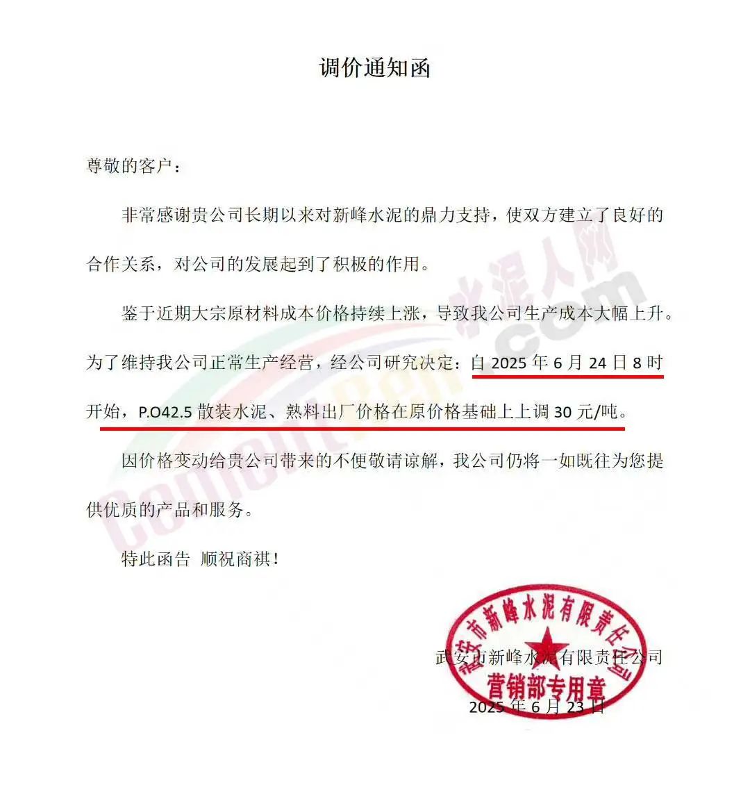 武安市新峰水泥有限责任公司通知,鉴于近期大宗原材料成本价格持续上涨,导致公司生产成本大幅上升,为了维持公司正常生产经营,经公司研究决定:自2025年6月24日8时开始,P.O42.5散装水泥、熟料出厂价格在原价格基础上上调30元/吨。