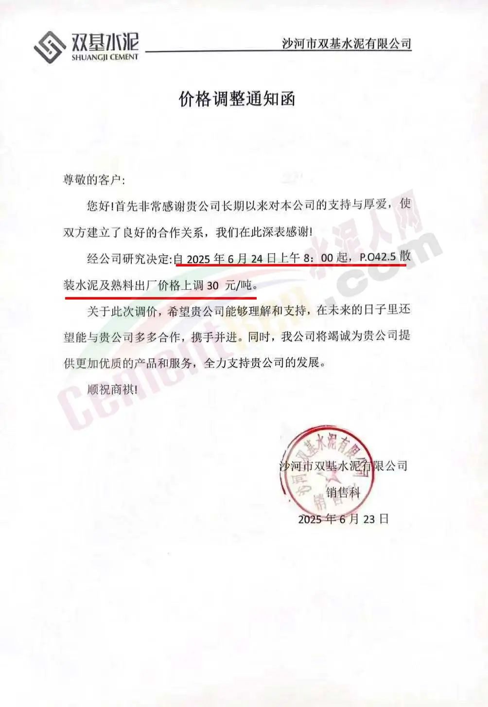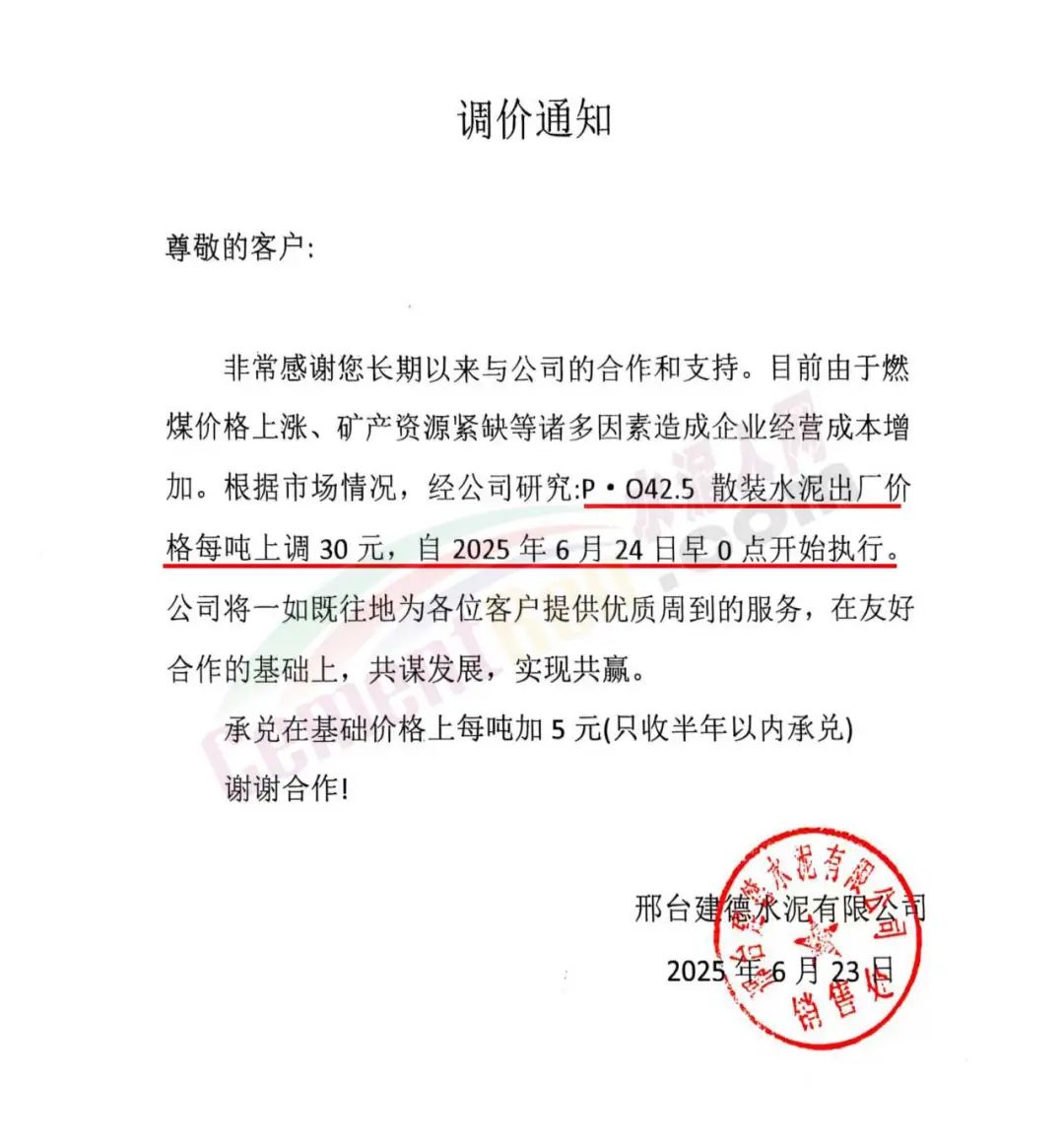 沙河市双基水泥有限公司通知,经公司研究决定自2025年6月24日上午8时起,P042.5散装水泥及熟料出厂价格上调30元/吨。