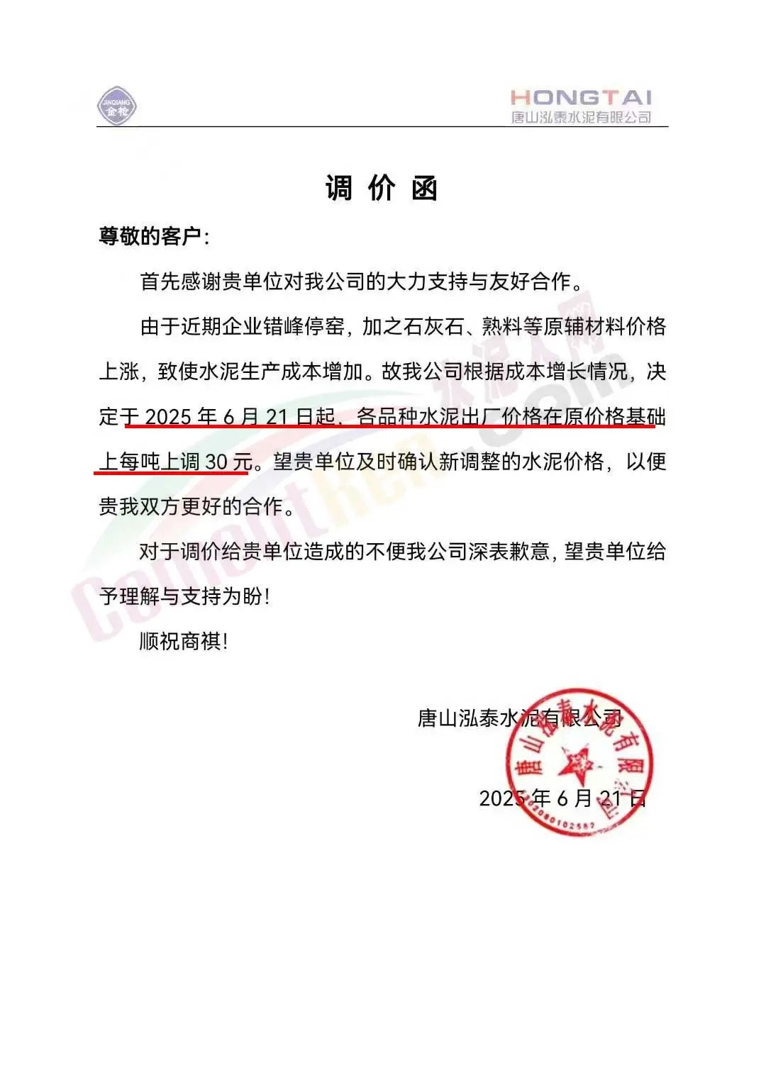 唐山泓泰水泥有限公司通知,6月21日起各品种水泥出厂价在原价基础上上调30元/吨。