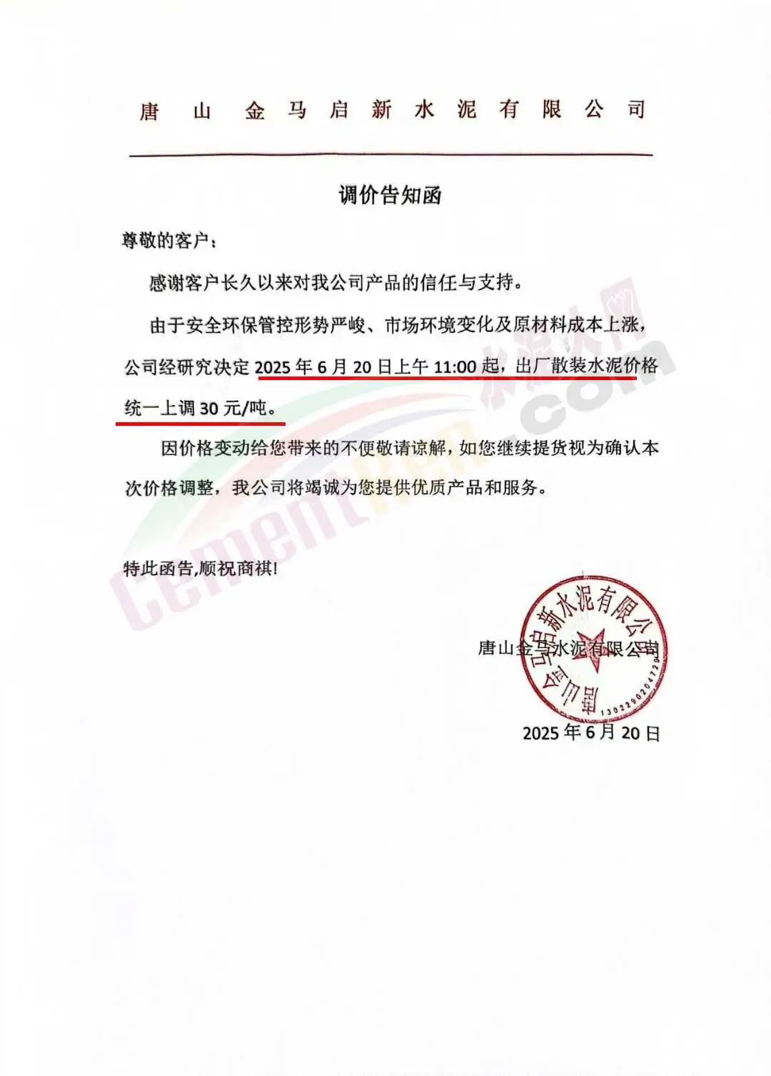 唐山金马水泥有限公司通知,由于安全环保管控形势严峻、市场环境变化及原材料成本上涨:公司经研究决定2025年6月20日上午11:00起,出厂散装水泥价格统一上调30元/吨。