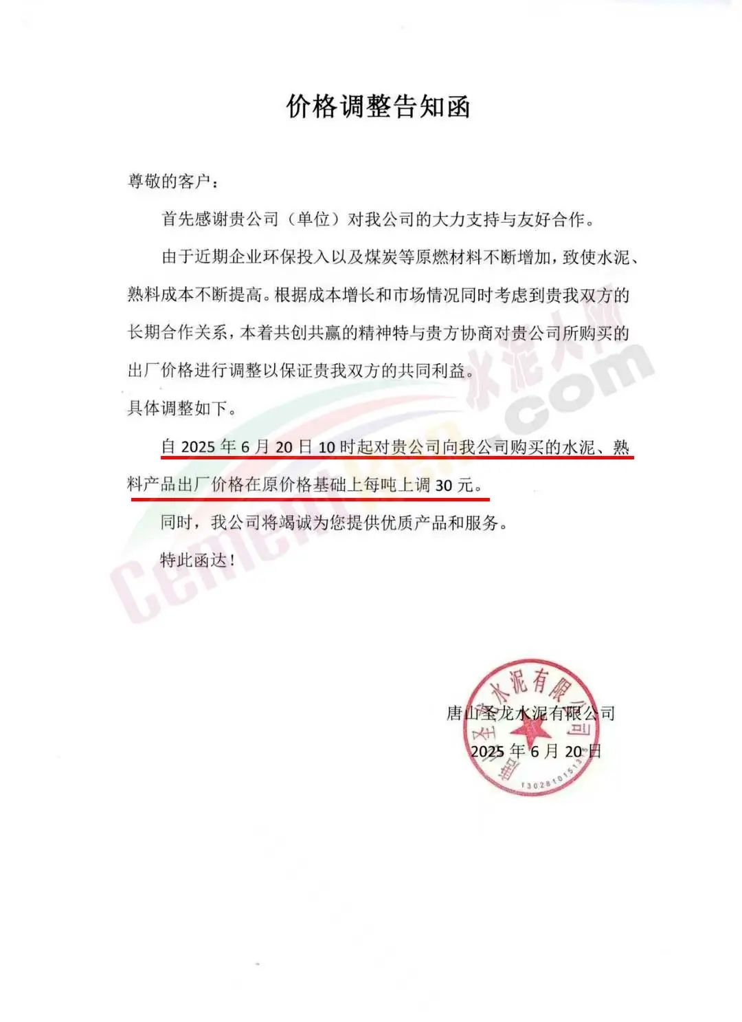 唐山圣龙水泥有限公司通知,6月20日10时起,水泥、熟料产品出厂价格在原价基础上上调30元/吨。