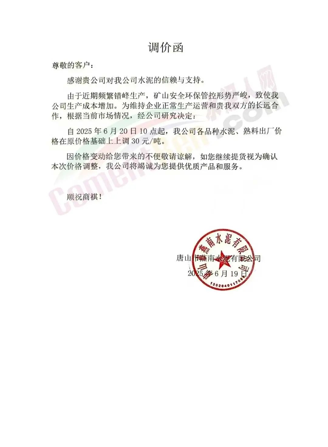 唐山市燕南水泥有限公司通知,由于近期频繁错峰生产,矿山安全环保管控形势严峻,致使公司生产成本增加。为维持企业正常生产运营,根据当前市场情况,经公司研究决定:自2025年6月20日10点起,公司各品种水泥、熟料出厂价格在原价格基础上上调30元/吨。