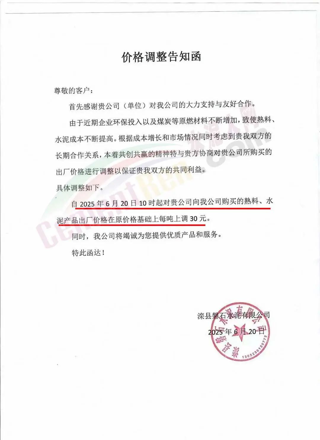 滦县磐石水泥有限公司通知,由于近期企业环保投入以及煤炭等原燃材料不断增加,致使熟料、水泥成本不断提高。根据成本增长和市场情况,出厂价格自2025年6月20日10时起熟料、水泥产品出厂价格在原价格基础上上调30元/吨。