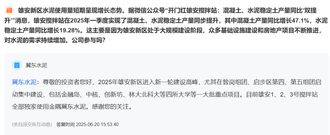 值得关注的是,近期冀东水泥在上市公司平台回应投资者时表示:”2025年雄安新区进入新一轮建设高峰,尤其在昝岗组团、启步区第四、第五组团启动集中建设,包括金融岛、中核、创新坊、林大北科大等四所大学等一大批重点项目。目前雄安1、2、3号搅拌站全部独家使用金隅冀东水泥。“