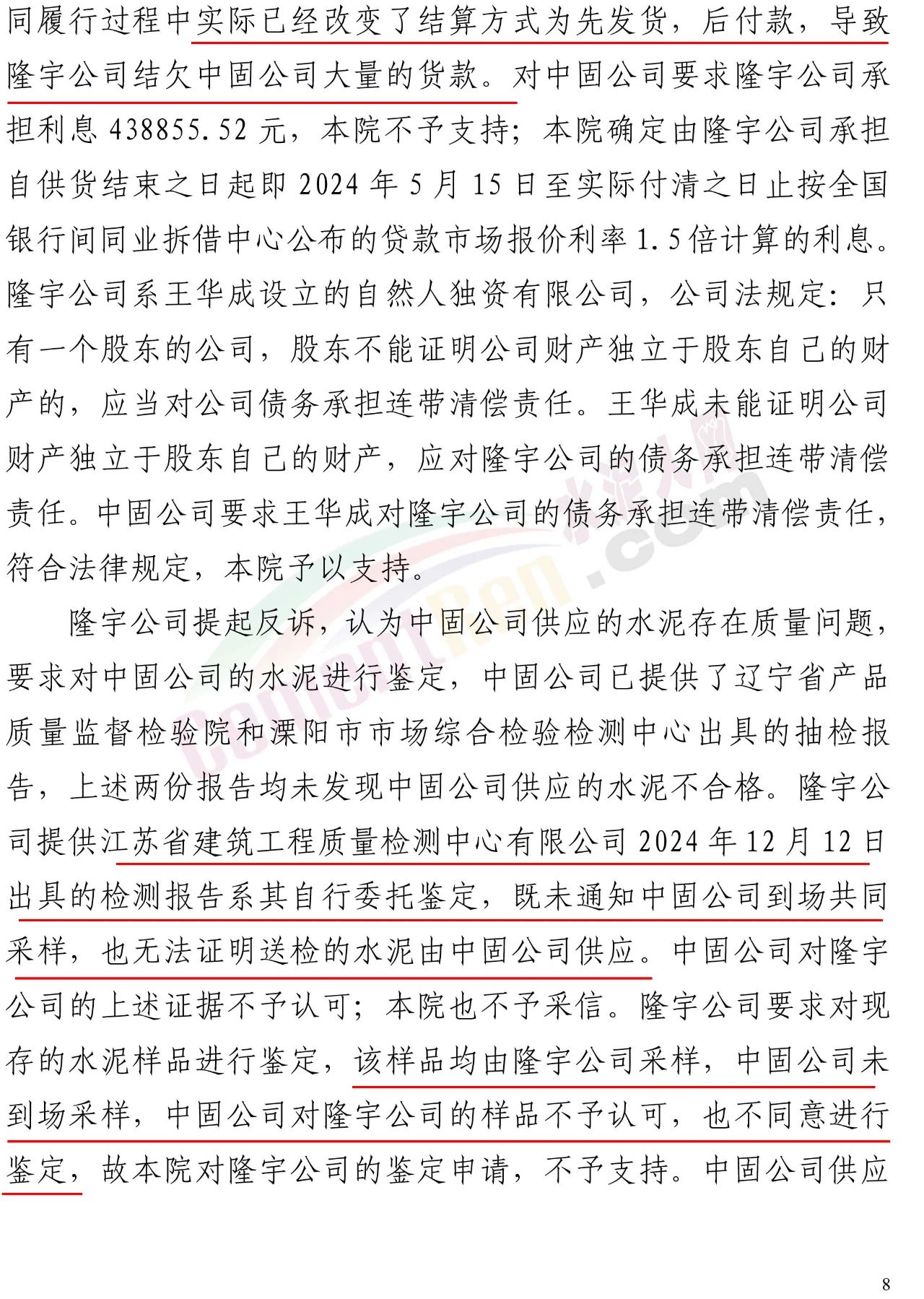 法院还驳斥了隆宇公司关于其下游混凝土质量问题系由中固水泥造成的核心逻辑:“混凝土系由水泥、黄沙、石子、水和添加剂等各种其他材料按比例混合而成,不能仅因隆宇公司向他人供应的混凝土存在质量问题,就直接推定中固公司供应的水泥存在质量问题。”法院认为,隆宇公司的反诉请求与事实不符,缺乏充分、合法、有效的证据链支撑。
