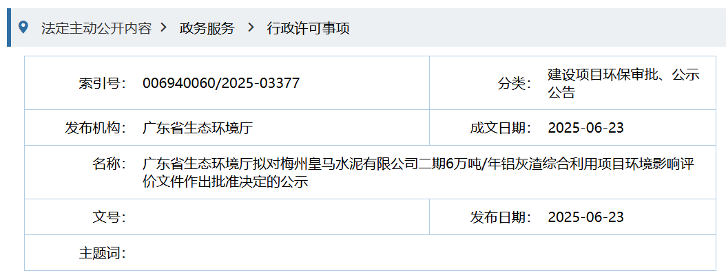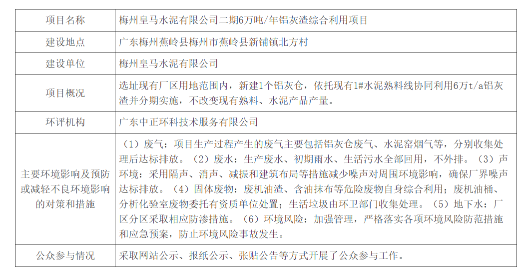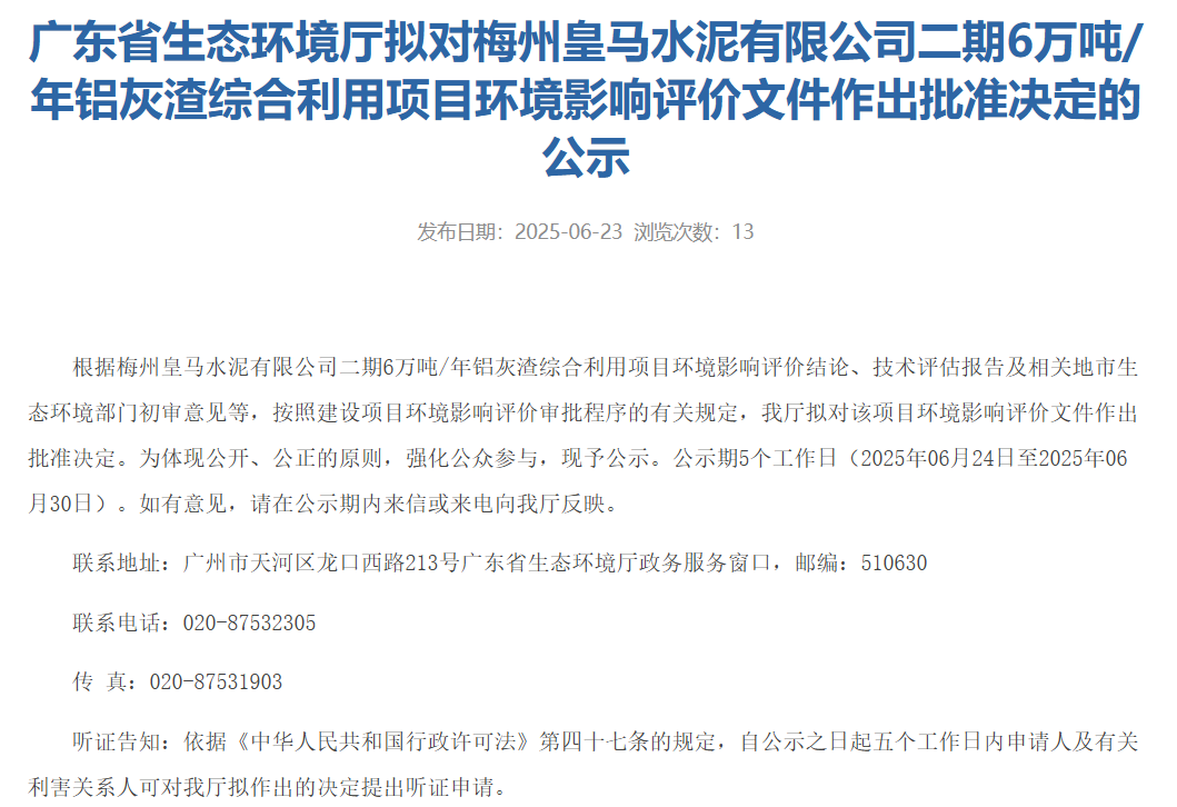 日前,广东省生态环境厅发布拟对梅州皇马水泥有限公司二期6万吨/年铝灰渣综合利用项目环境影响评价文件作出批准决定的公示称,根据梅州皇马水泥有限公司二期6万吨/年铝灰渣综合利用项目环境影响评价结论、技术评估报告及相关地市生态环境部门初审意见等,按照建设项目环境影响评价审批程序的有关规定,广东省生态环境厅拟对该项目环境影响评价文件作出批准决定。为体现公开、公正的原则,强化公众参与,现予公示。公示期5个工作日(2025年06月24日至2025年06月30日)。项目为在现有厂区用地范围内,新建1个铝灰仓,依托现有1号水泥熟料线协同利用6万t/a铝灰渣并分期实施,不改变现有熟料、水泥产品产量。