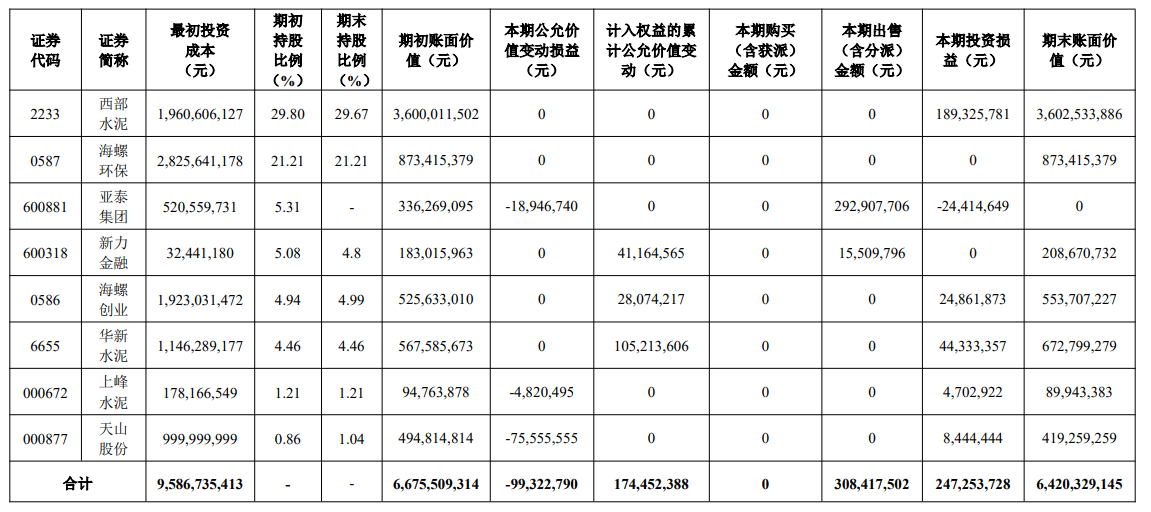 水泥人网注意到,海螺水泥2024年度报告中披露,海螺水泥除持有西部水泥股份外,还持有亚泰集团、华新水泥、上峰水泥、天山股份等企业股份,西部水泥为其持股比例最大的同行企业。