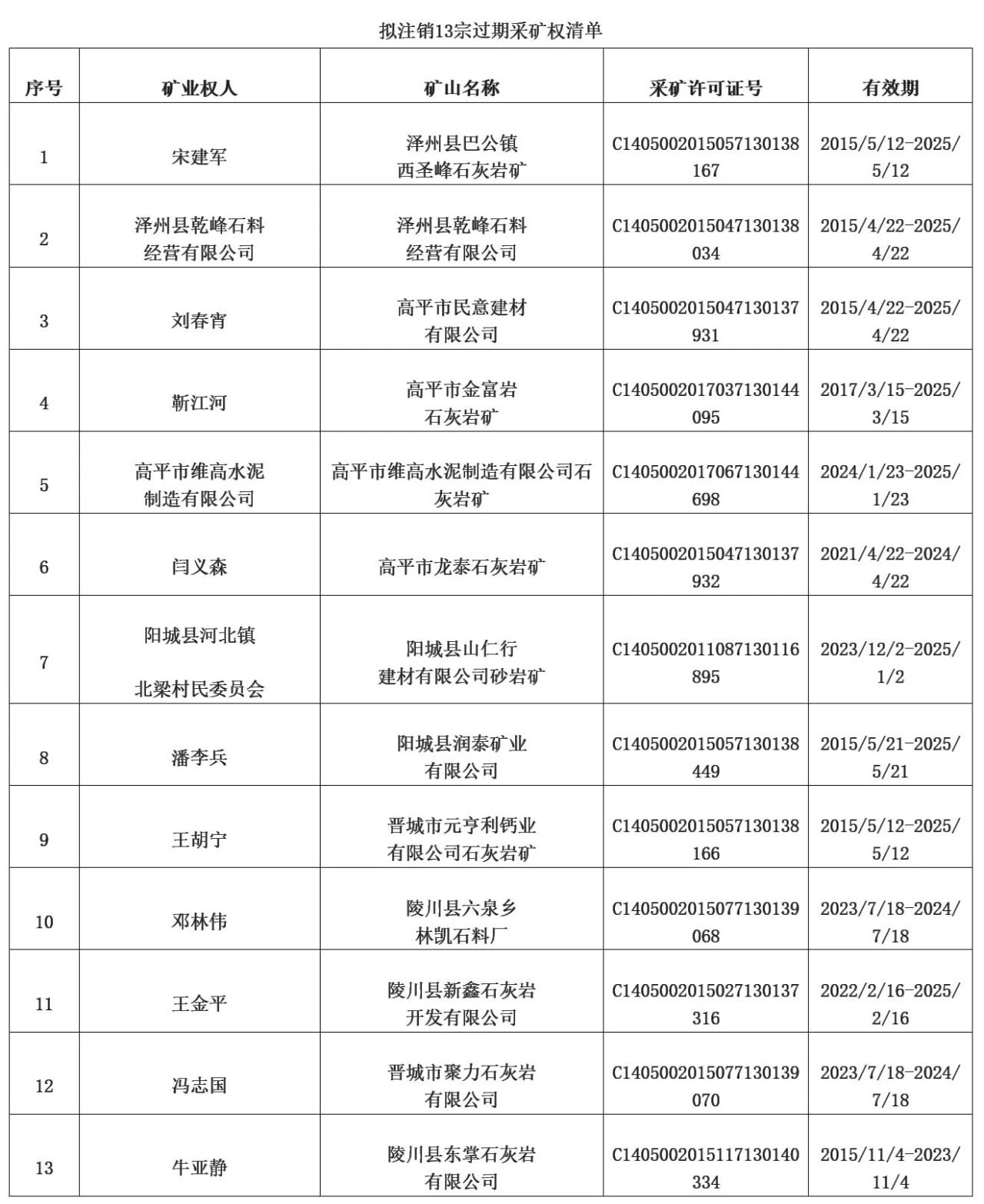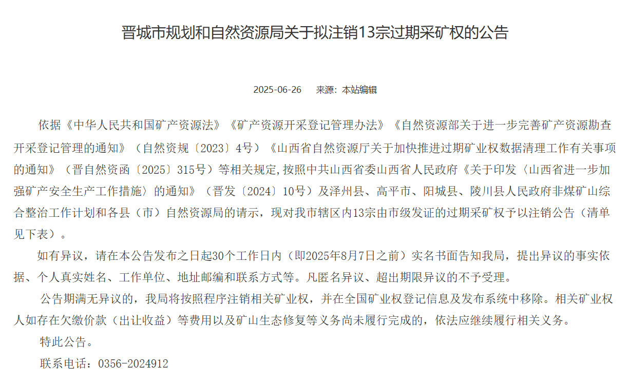 日前,山西晋城市规划和自然资源局发布公告文件称,依据相关文件通知,对市辖区内13宗由市级发证的过期采矿权予以注销公告。