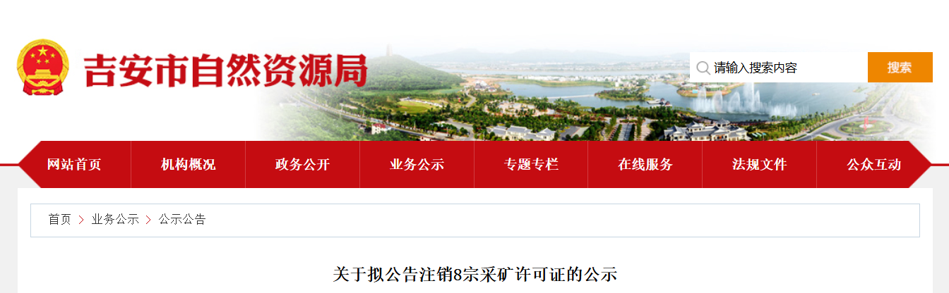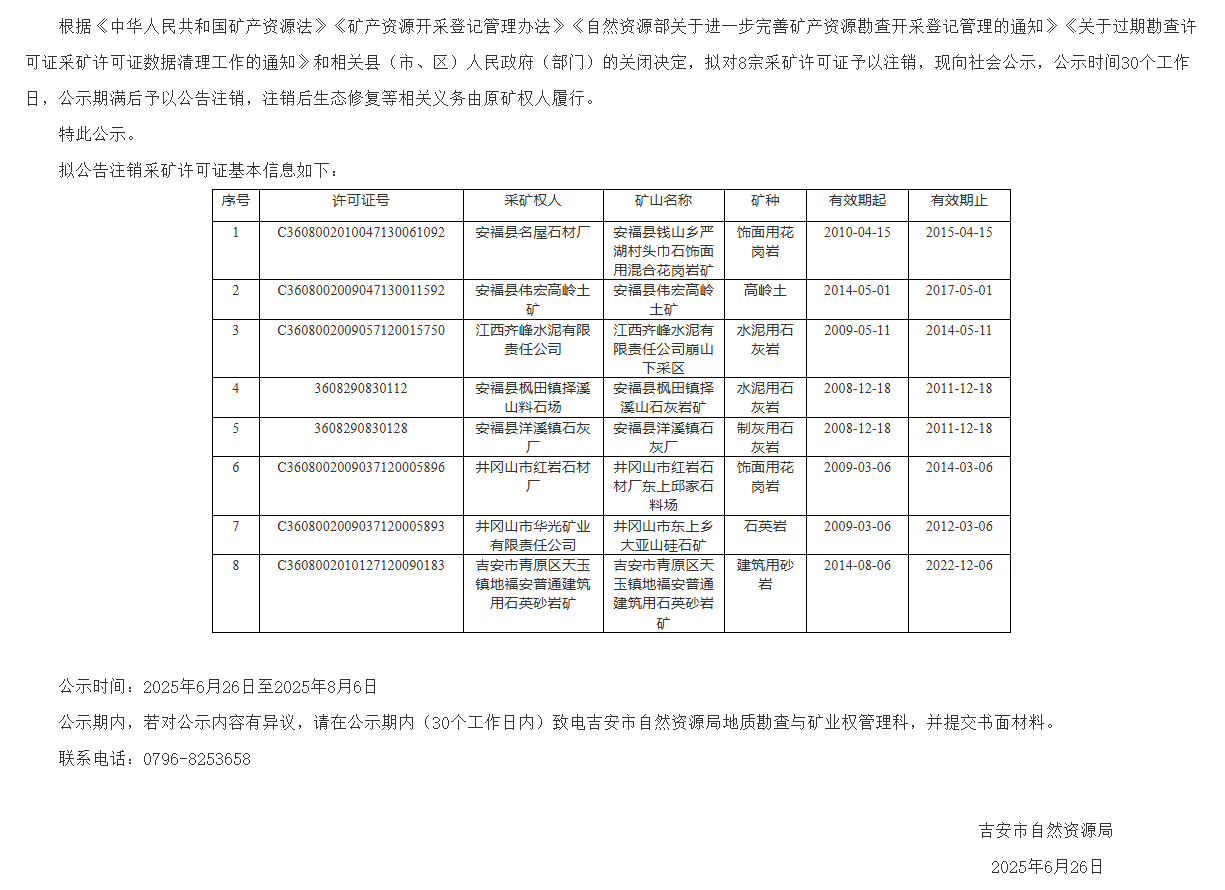 同期吉安市自然资源局发布关于拟公告注销8宗采矿许可证的公示称,拟对8宗采矿许可证予以注销。