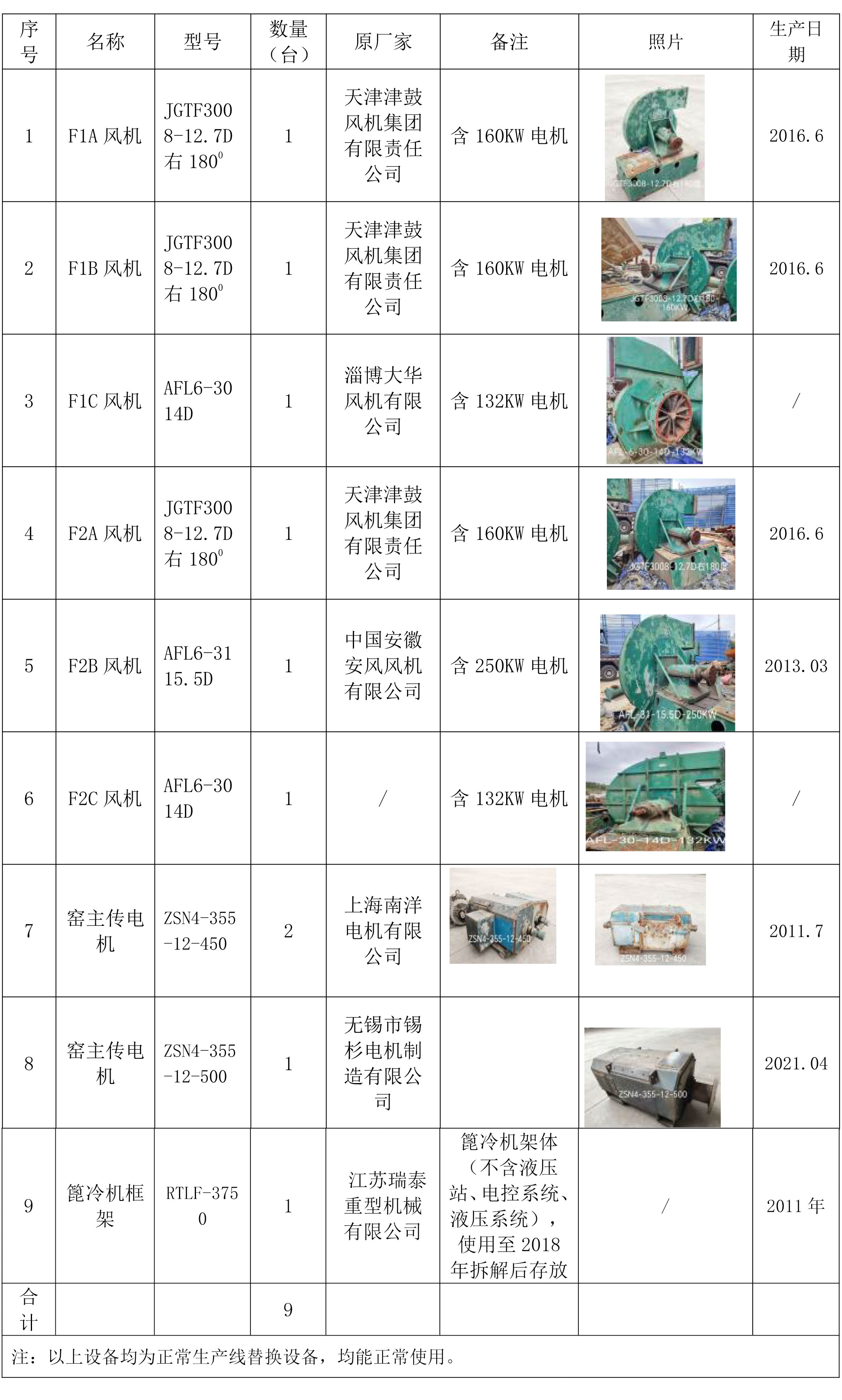 一、外卖处理内容:闲置回转窑主传电机、篦冷机风机、篦冷机框架。技术参数以及外卖范围详见附件。