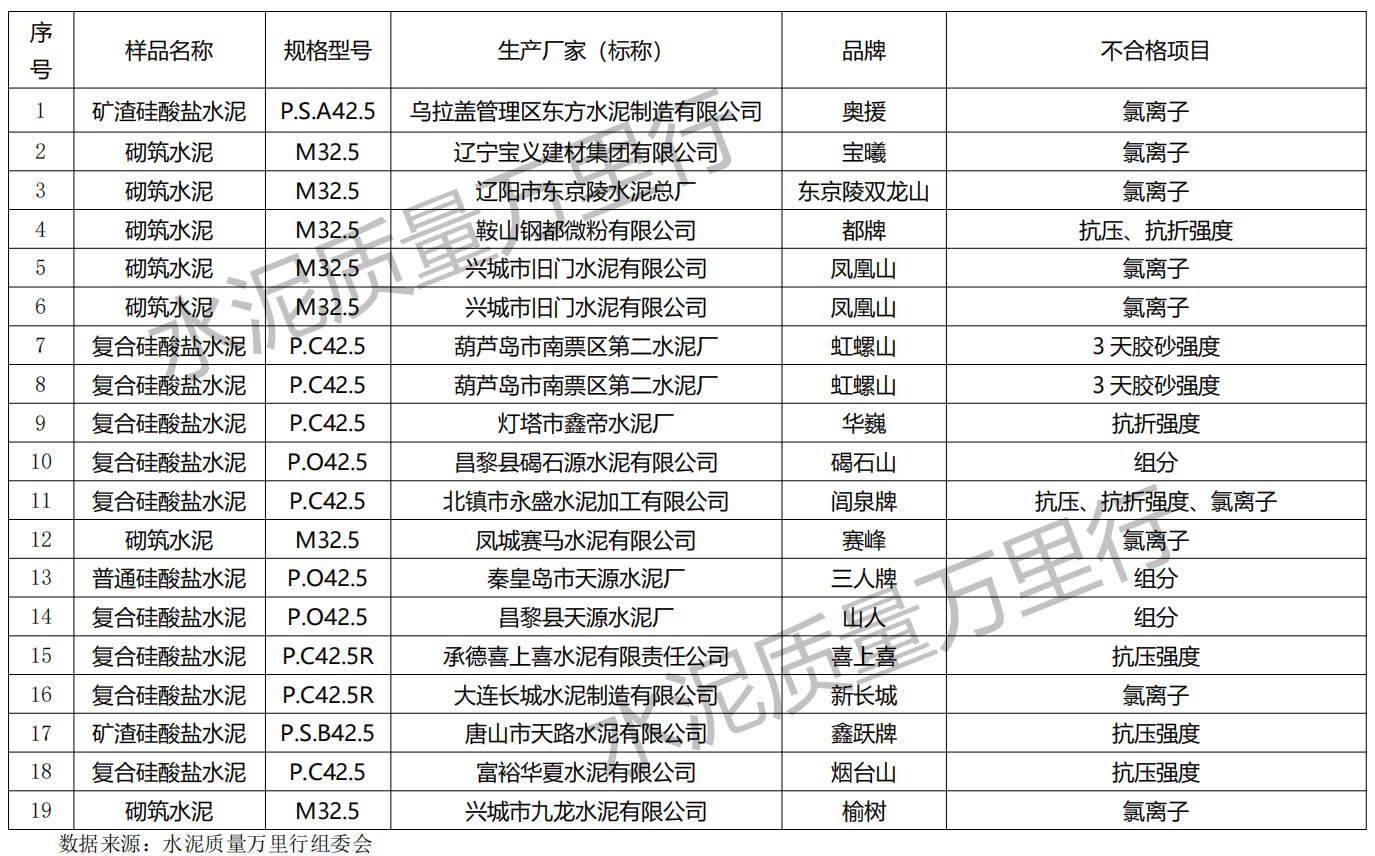 另一方面是质量达标率偏低。80批次样品中,19批次检测结果不符合国家标准要求,占比23.75%。不合格项目集中在氯离子含量、强度性能及组分三大类:其中,兴城市旧门水泥有限公司、辽阳市东京陵水泥总厂等8家企业的产品氯离子超标;鞍山钢都微粉有限公司“都牌”砌筑水泥等6批次产品,同时存在抗压与抗折强度不合格问题;昌黎县碣石源水泥有限公司、秦皇岛市天源水泥厂等企业的3批次产品,因组分不符合标准。
