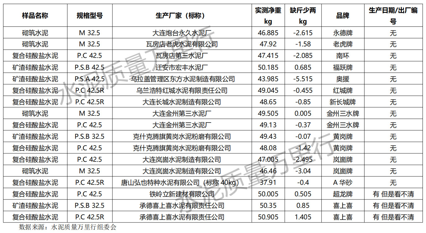 近日,水泥质量万里行组委会发布泛东北地区流通领域水泥抽检新结果。在已完成的80批次抽检中,袋重不足问题突出,同时近四分之一产品存在质量不达标情况,部分企业还涉嫌资质与商标违规。