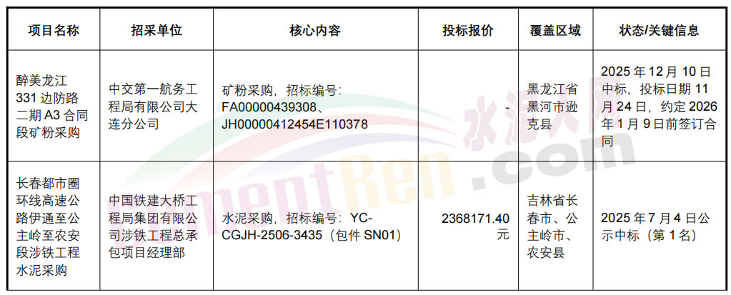 尽管存在质量隐患,四平佳润的产品仍成功打入东北重大工程供应链,销售网络覆盖吉林、黑龙江核心区域。招投标信息显示,2025年11月,企业凭借“大连分-醉美龙江331项目-公开招标-矿粉”项目中标,约定于2026年1月9日前与中交第一航务工程局有限公司签订合同,供货至黑龙江省黑河市逊克县醉美龙江331项目部,该项目为边防路重点工程,对建材质量有严格要求。